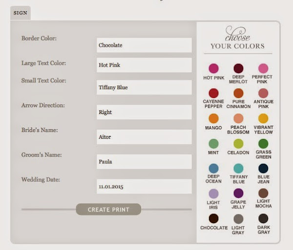Podéis personalizar el color de las letras, el nombre de los novios y la fecha de la boda. La tipografía no es editable. Font: American TypeWriter y Feel Script