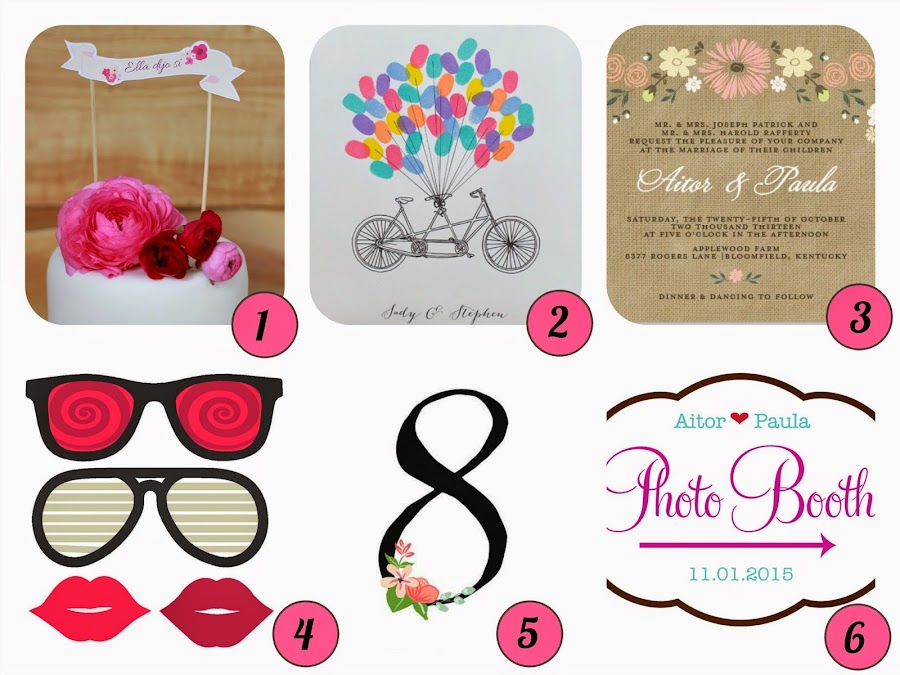 1. Cake topper 2. Lienzo de huellas dactilares 3. Invitación de boda