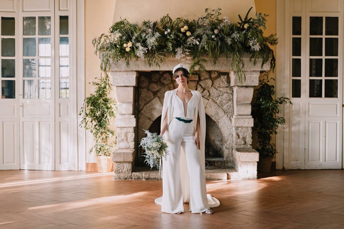 Los outfits para la inspiración de boda invernal elegidos fueron un mono largo blanco estrecho con abertura en la parte final del pantalón, el cual le da dinamismo al andar, combinado con una capa larga y con un poncho bordado el cual nos ofrece un toque elegante, dos combinaciones prácticas, elegantes y fuera de lo tradicional.