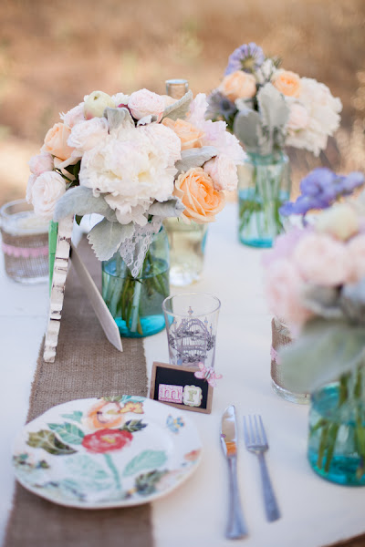 También puedes coger ideas para decorar la mesa de la celebración: Mantelería blanca y un camino de mesa hecho con tela de arpillería, botecitos de cristal para colocar velas, flores a juego con el ramo de novia y una vajilla y cristaleria preciosisima. ¿Os gusta éste estilo?