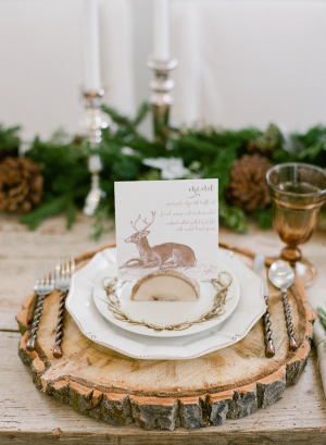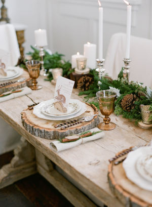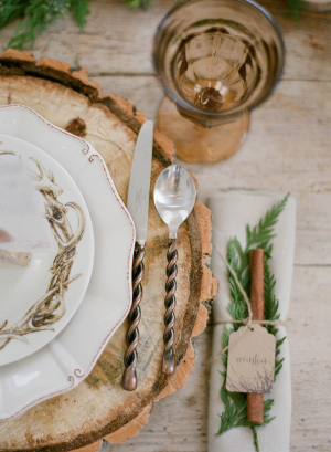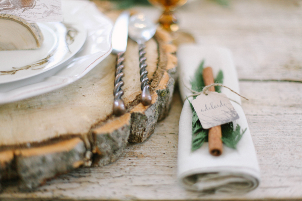 Tocones de madera hacen de posaplatos acompañados de una cubertería, vaijilla y cristalería espectaculares.
