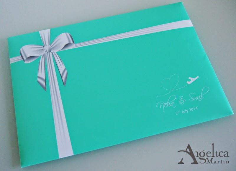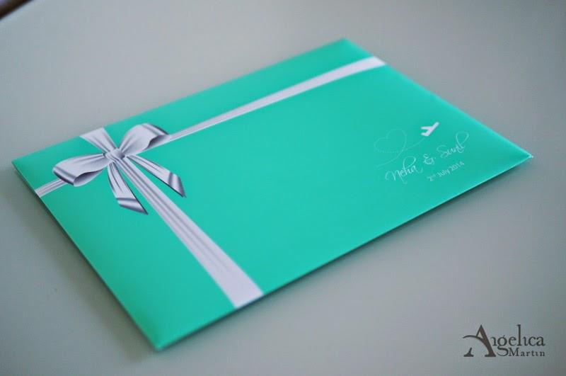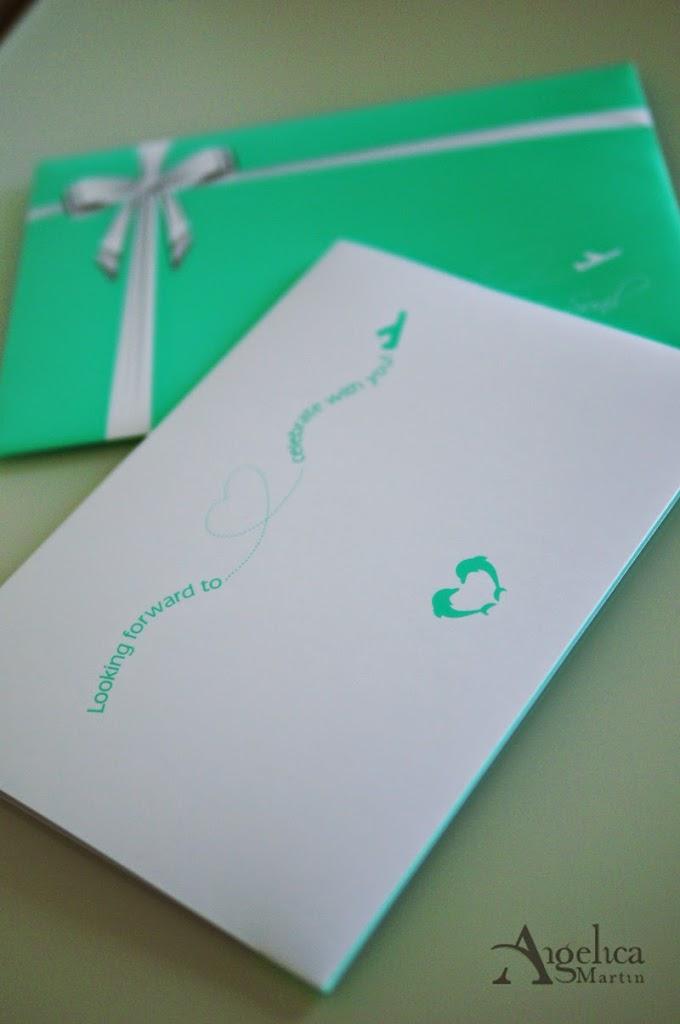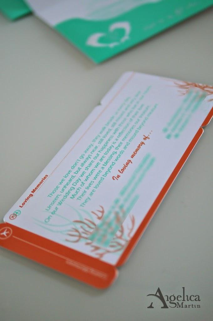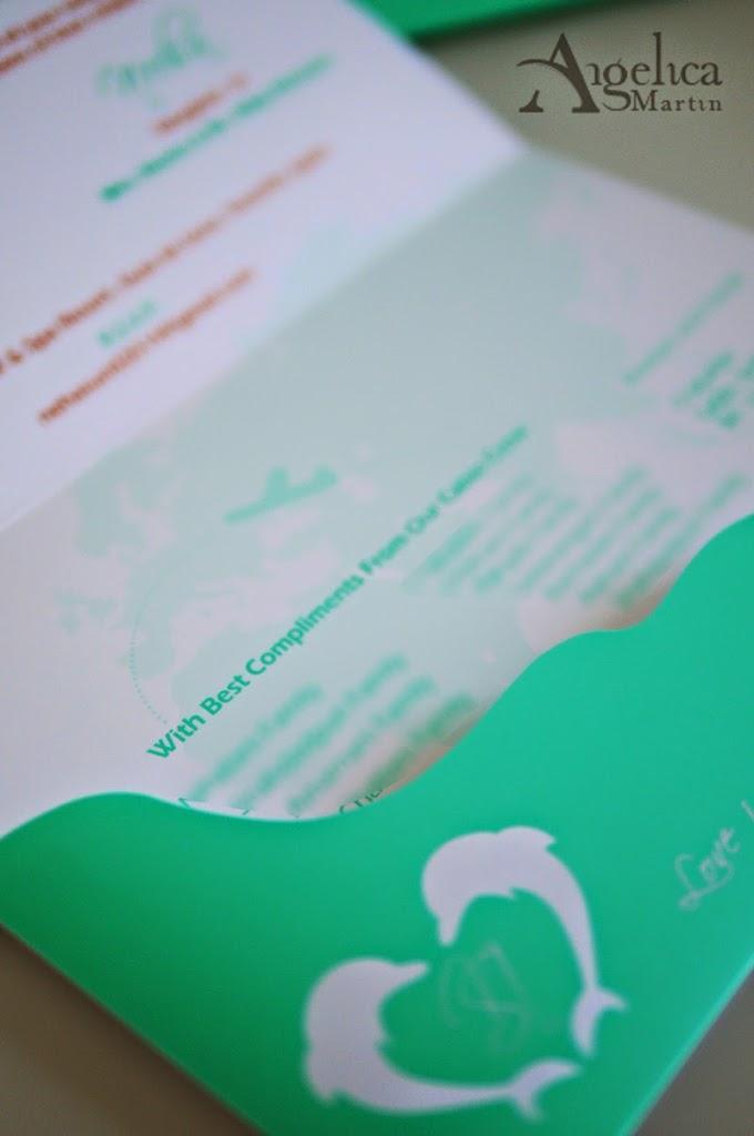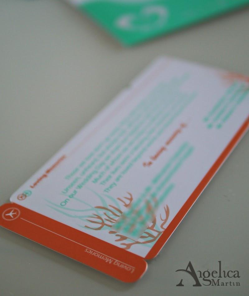 Querían una invitación como si fuese un billete de avión compuesto por un porta tarjeta y tres “tarjetas de embarque” ya que la celebración es de dos días y el tercero un espacio para aquellas personas que ya no están con ellos, una costumbre de su religión.