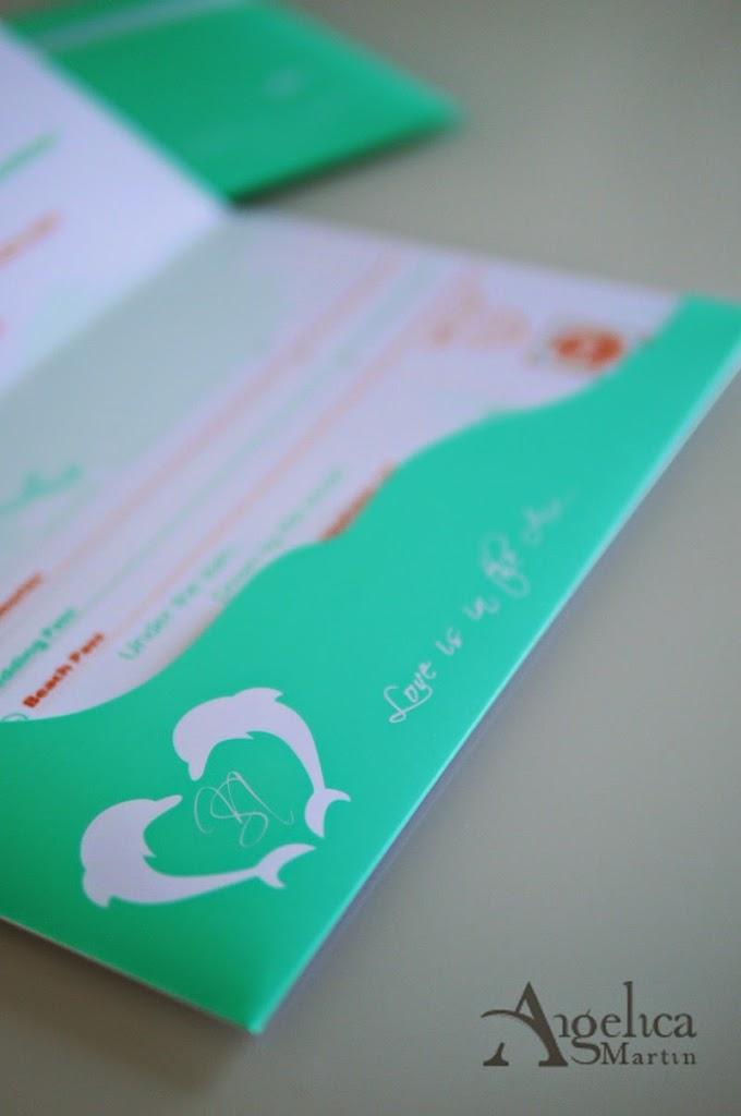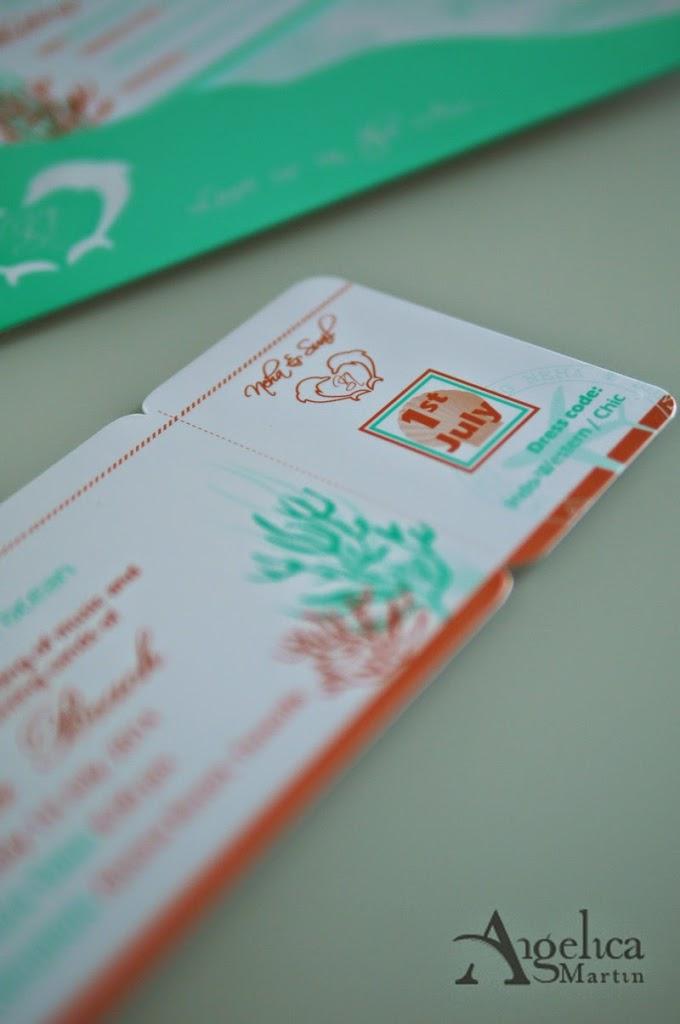 En esta tarjeta de embarque resaltamos plantas marinas que continuará en el resto de las tarjetas. Como el logo de ellos (los delfines) y el toque del sello donde están los nombres de los protagonistas.