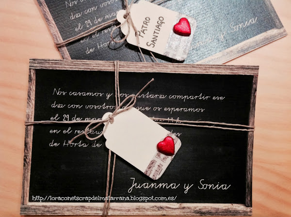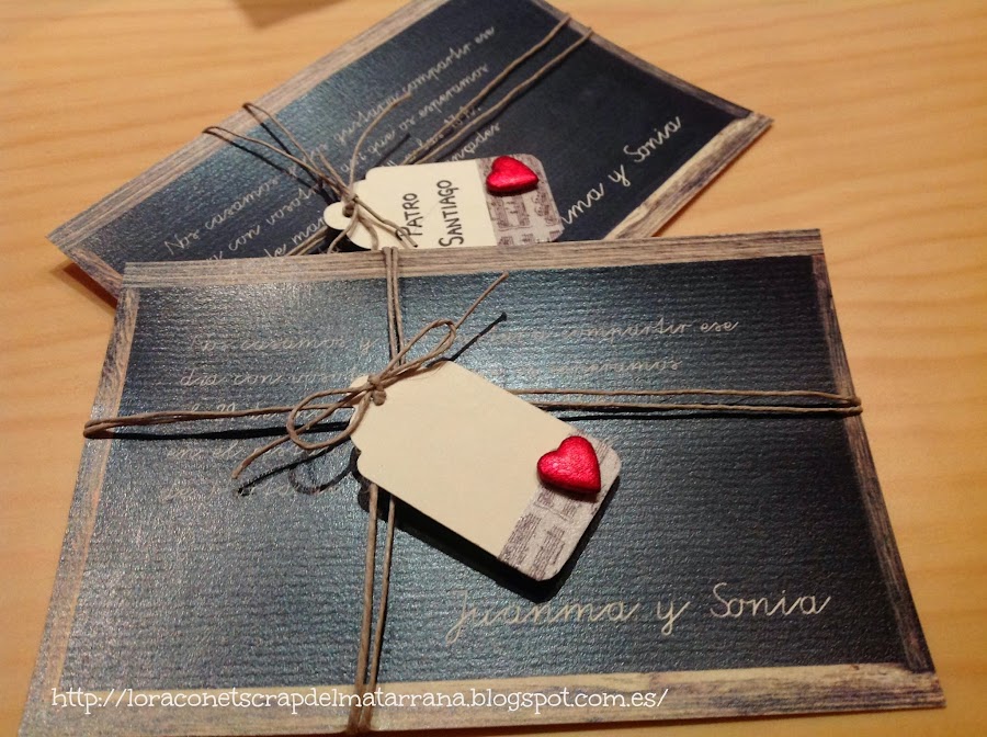 Son dos maestros (por ello, esa pizarra escolar...jajaja) que querían algo muy sencillo! y así fue! sin sobres, solo utilizando un poquito de cordel, washitape, unas etiquetas y unos pequeños adornos... quedaron así de bonitas!