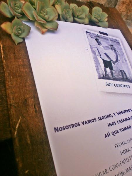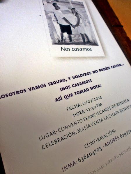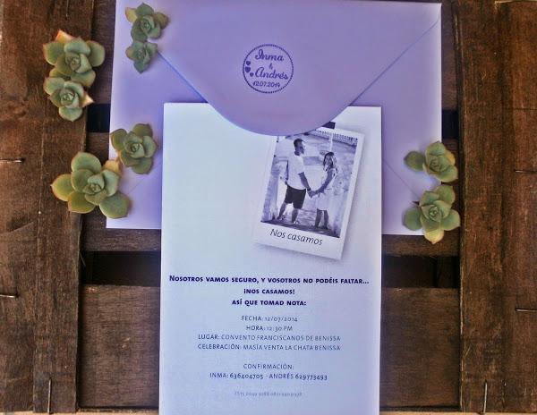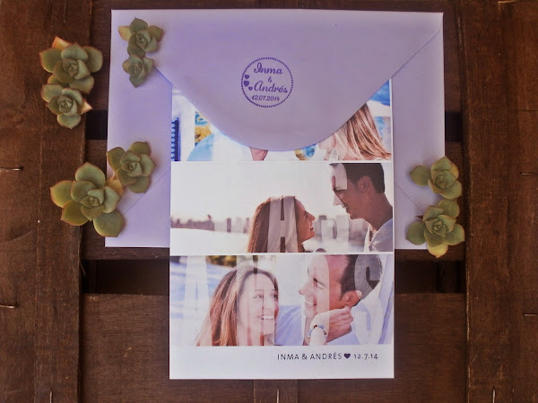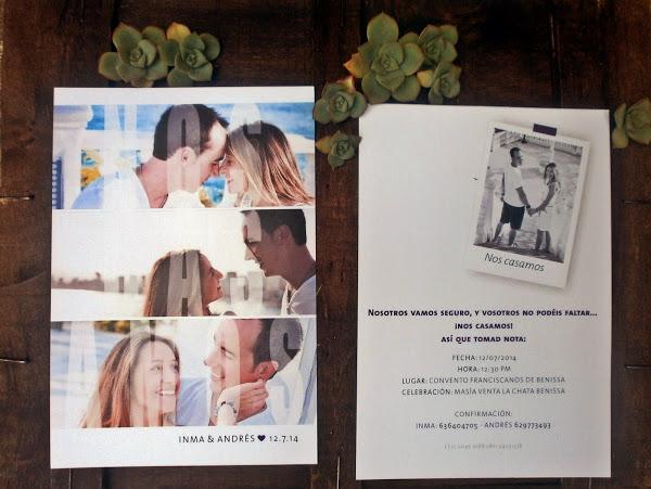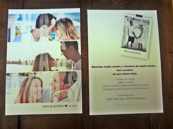 Una de las primeras cosas que decidimos en la boda de Inma y Andrés fueron sus invitaciones; utilizamos las fotos de su reportaje preboda, que realizó Pierluigi Cavarra el verano pasado en las playas de Benidorm y creamos una invitación tipo fotograma con diferentes planos centrales de los novios anunciando "NOS CASAMOS" en la parte frontal; como el color elegido para toda la boda es el tan de moda "Orquídea Radiante" en todas sus versiones se intentó colar notas de este color en la tipografía y algún otro detalle. La parte trasera sencilla, blanca y muy luminosa, con una foto tipo polaroid y todos los datos para que los invitados no falten a su boda.