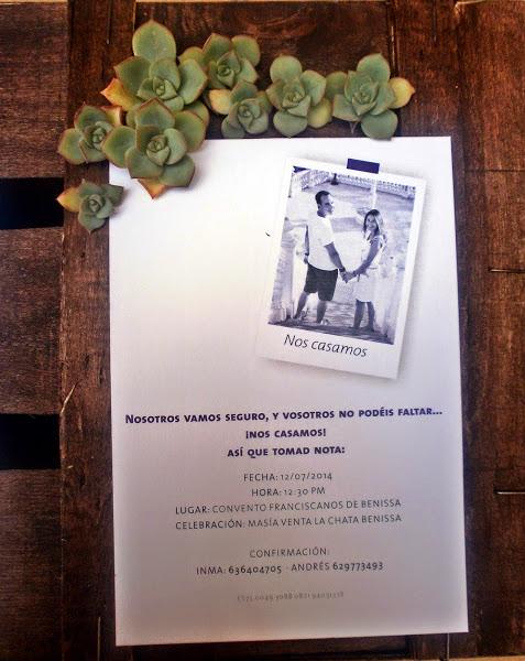 Cada vez me doy más cuenta de que en la sencillez encontramos la perfección, en las invitaciones tan sólo queríamos mostrar el amor que se tienen Inma y Andrés y creo que lo conseguimos. Gracias por haber confiado en mi para acompañaros en vuestro camino hacia el gran día B.
