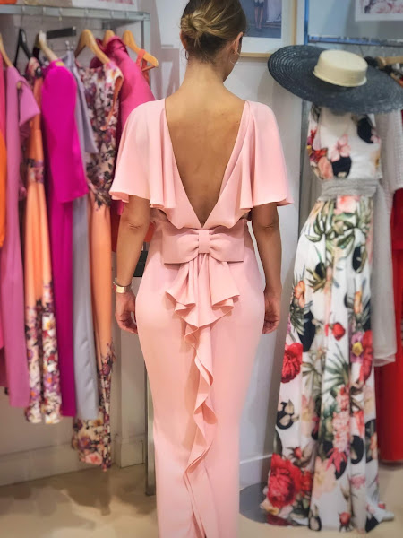 Por último, el vestido rosa palo es muy dulce, para una invitada joven que quiere ir de largo pero no quiere ir demasiado seria o parecer la madre de los novios. Tiene una espalda también preciosa, y de nuevo el detalle del lazo hace la retaguardia más bonita.