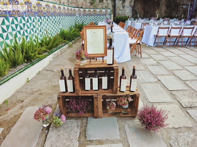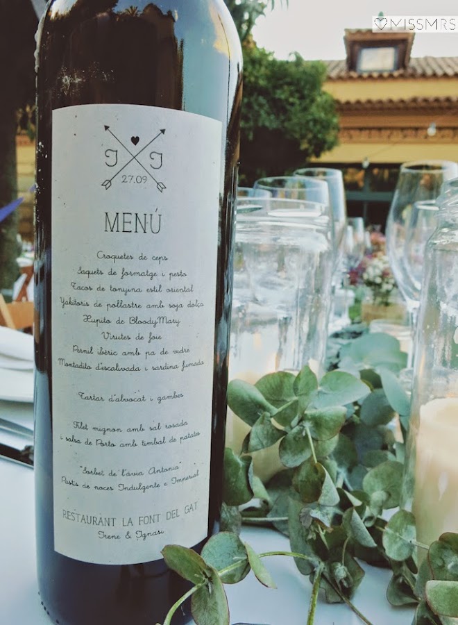 Además de las invitaciones también diseñamos la papelería de la boda. En este caso, hicimos un seating plan a base de botellas de vino donde colgaba la lista de invitados que había en cada mesa. Los meseros también se encontraban impresos en botellas de vino, aunque en este caso el soporte también servía para incluir el menú, pues es una buena manera de ahorrarse la impresión de más de 100 menús que luego se tiran a la basura. Los nombres de los invitados llevaban también la tipografía y el logo de las invitaciones, todo estaba conjuntado.