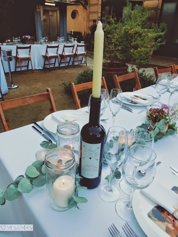 Utilizamos botellas de vino para la decoración, tanto para el seating como para decorar las mesas, ya que nos pareció una combinación perfecta de elementos para la ocasión. En las mesas utilizamos las botellas como meseros además de soporte para el menú, todo a juego con las invitaciones de la boda (que espero poder publicar pronto!).