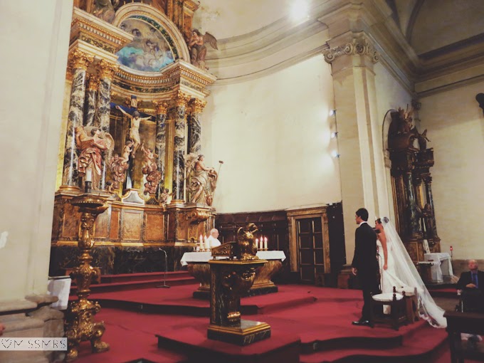 La ceremonia religiosa se celebró en la Iglesia de Sant Felip Neri en el barrio gótico de Barcelona, un lugar con mucho encanto y mucha historia. Los novios se alojaron en el Hotel Neri que se encuentra en la misma plaza que la Iglesia, así que la novia podía ver todo lo que pasaba mientras esperaba para hacer su aparición.