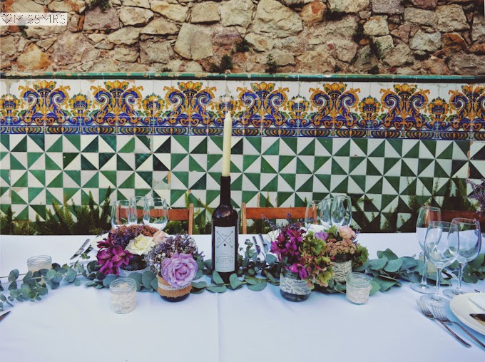 La mesa principal, como en todas las bodas que hemos hecho en La Font del Gat, estaba situada frente la magnífica pared embaldosada que preside el recinto ajardinado, un mosaico en tonos verdes que le da al restaurante esa personalidad tan especial y que es perfecto como fondo para las parejas de novios que deciden celebrar allí su boda.