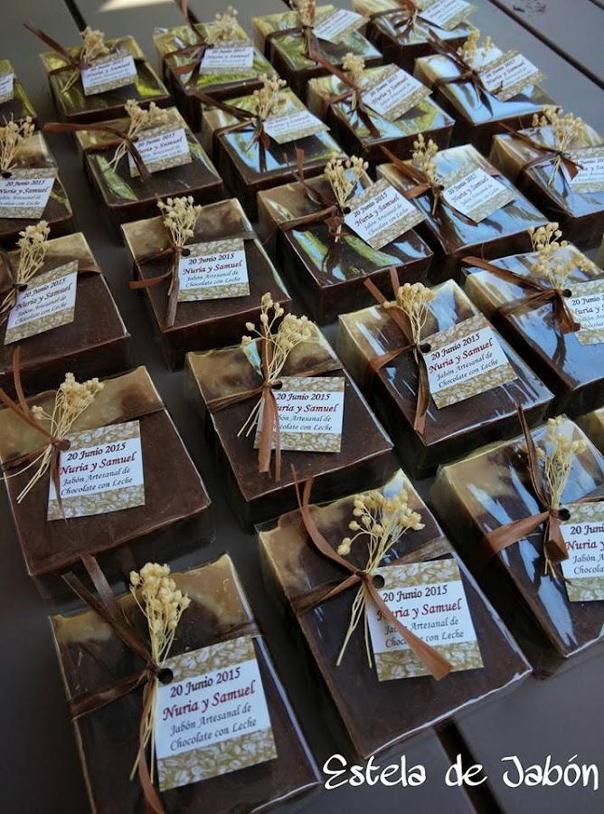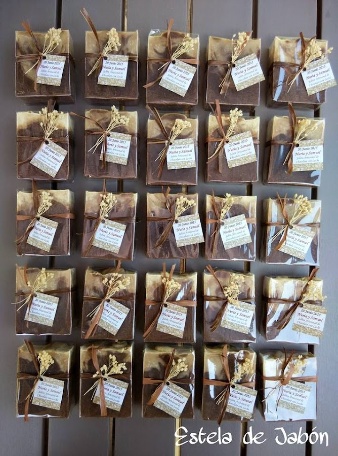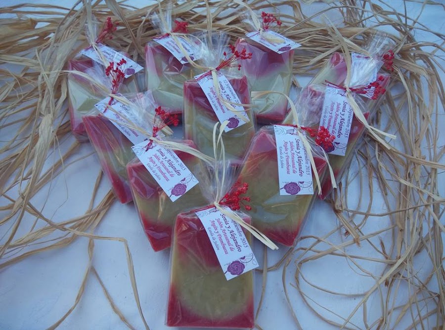 Cada vez va siendo más habitual regalar en bodas y otros eventos como bautizos, comuniones, etc. algún detalle útil y original. Yo recomiendo siempre apoyar a los pequeños artesanos que hacemos nuestros productos con mucho esfuerzo, cariño y prácticamente sin beneficios (alguno hay, claro, si no... muy tontos seríamos :-P ). La temporada de verano (junto con el final de la primavera y el principio del otono) es la más elegida por la gente para celebrar estos momentos, así que hemos tenido unas cuantas bodas últimamente a las que los novios han llevado jaboncitos de los nuestros a los invitados. Os dejo unas fotitos para que veáis el resultado final de jabones para eventos, espero que os gusten.