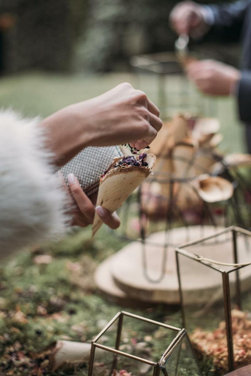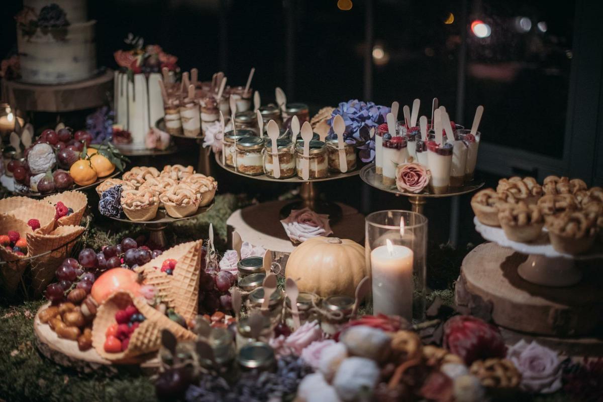 Jen y Sergio soñaban con una boda inspirada en paisajes otoñales y en los bosques encantados de los cuentos de la cultura escandinava. Tonos ocres, el rojo velvet o el morado que recuerda a los frutos silvestres predominaron en la paleta que coloreó la decoración, las flores y hasta los dulces!