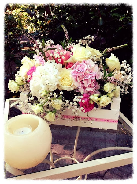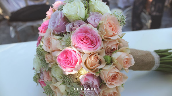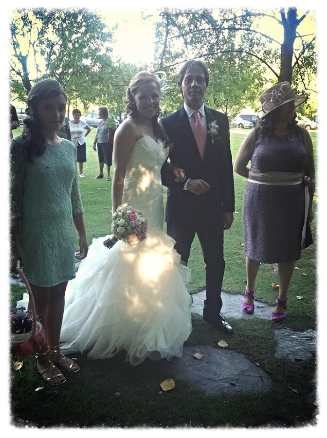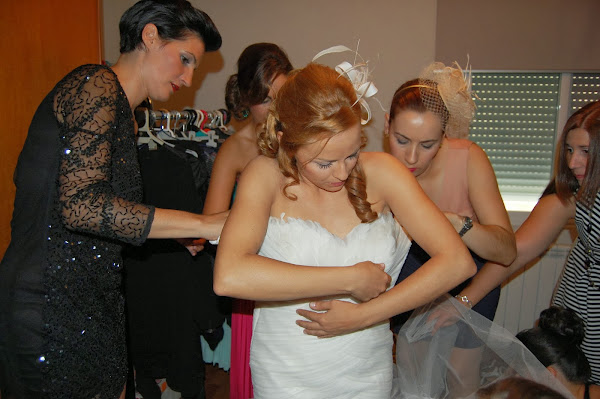 Me levanté súper tranquila y como en toda boda tiene que haber una anécdota, la mía fue que hubo una avería grandísima en el pueblo y tuvieron cortada el agua hasta el mediodía...imagínate todo el mundo desesperado porque no se podía duchar y yo diciendo "bueno no os preocupéis, si la cosa se pone fea me hago una coleta y listo". Mi tranquilidad no era entendida por nadie...soy una persona muy nerviosa y sin nada de paciencia...y me preguntaban todo el rato que si estaba bien. Fui a recoger mi ramo y los prendidos del novio y padrino, me emocioné mucho porque era muchíiisimo más bonito de lo que yo me esperaba, lo había dejado en manos de Esther de La Flor de Cerezo, al igual que todas las flores de la boda. Comí y...¡¡me dormí en el sofá!! fueron 20 minutillos, lo justo para que a las 14.00 llegara el agua de nuevo jajajaja.