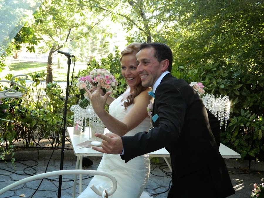 La ceremonia fue civil ,muy corta a petición nuestra. Nos casó el juez de paz y leyeron mi amiga Violeta (lo suyo y lo de mi amiga Raquel) y mi cuñada Isa...fue muy emotivo y divertido recordando anécdotas. Lloramos un montón...y al terminar con el besazo sonó "Sweet child of mine" de Guns and roses.