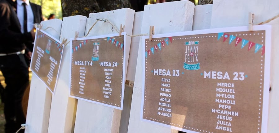 El seating fueron dos palet que pintamos de blanco ,pusimos cuerda natural y con unas pinzas dispusimos las mesas de los invitados, lo colocamos en el centro del jardín apoyados en un árbol. Todo la imagen de la boda nos la diseño Javi de Blanco Roto Diseño para Bodas, desde las invitaciones, seating, pai pai con el programa de bodas...y un montón de detalles más.