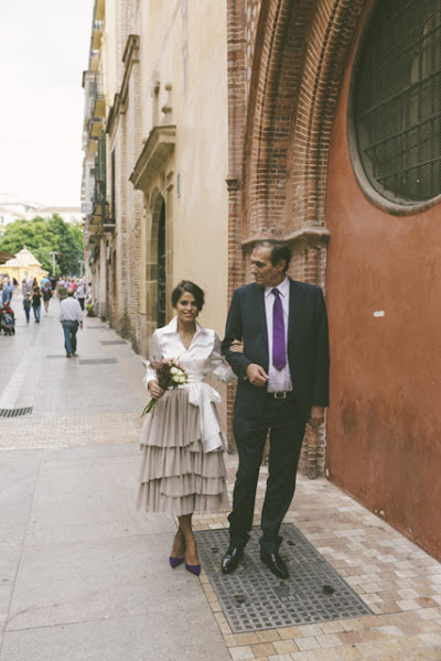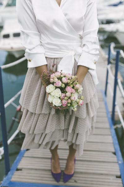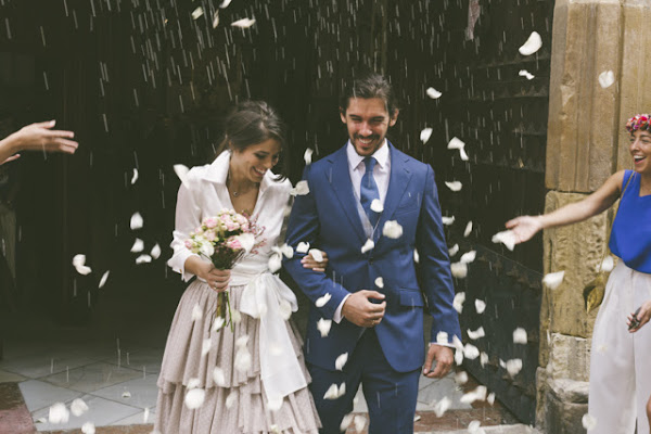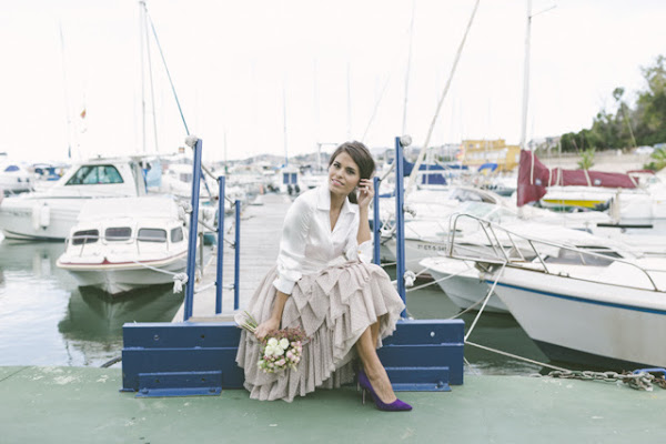 La novia, no quería el típico traje de novia, y se decantó por un falda en plumeti y una camisa.