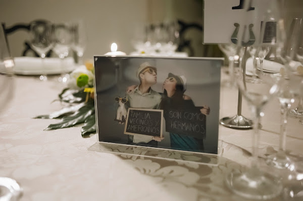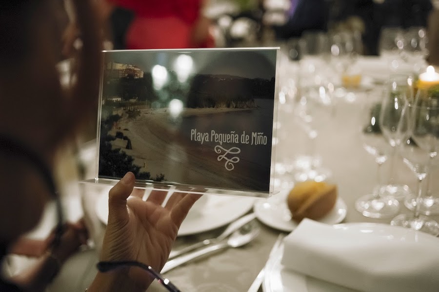 meseros eran marcos de metacrilato muy sencillos en los que un lado mostraba la foto y el nombre de la playa y por el otro lado había una foto de Jesús y mía haciendo el tonto y con una pizarra que incluía un mensaje adaptado a los invitados de cada mesa.