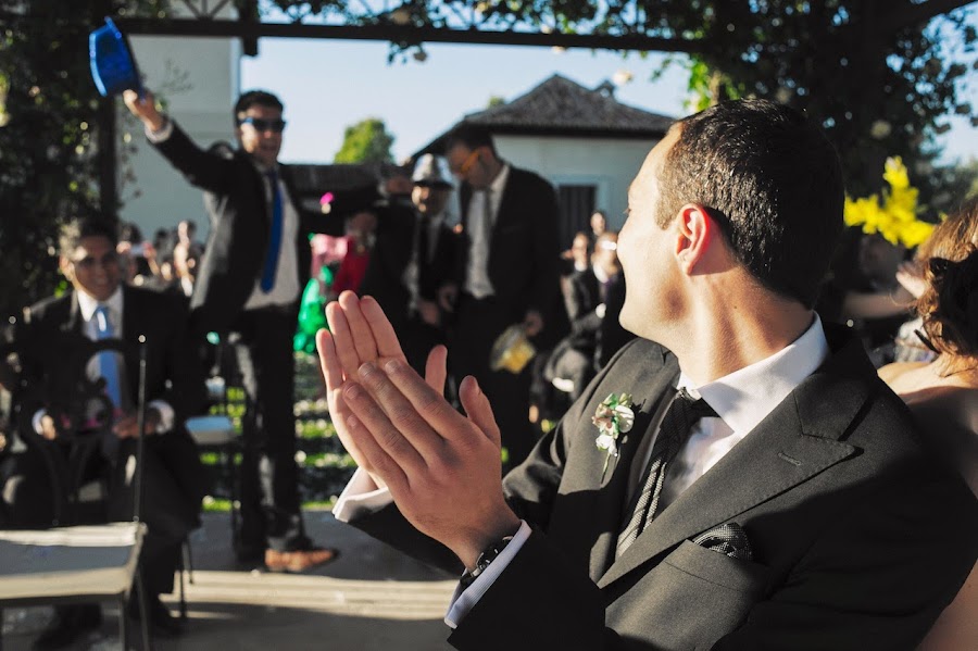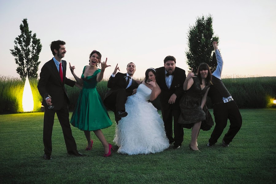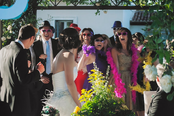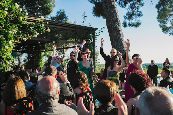 Y es que nuestro punto diferente fue la ceremonia. Somos una pareja tirando a payasa y bastante poco amiga de las tradiciones o rituales, así que, además de reescribirle al pobre oficiante todos sus textos tipo para personalizarla completamente, sorprendimos a los invitados con dos momentos musicales que cortaban la ceremonia: las canciones en directo de Bienvenidos de Miguel Ríos y Dime que me quieres de Tequila, con las letras adaptadas y con coros y bailecito de varios de los invitados (atrezzo incluido).