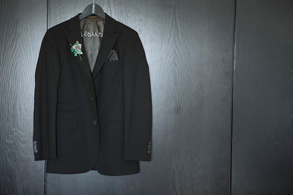 Su look consistió en un sencillo traje negro con camisa blanca y corbata estrecha y pañuelos negros, todo de Florentino, con zapatos negros de Martinelli y unos gemelos de oro blanco que le regalaron años atrás.