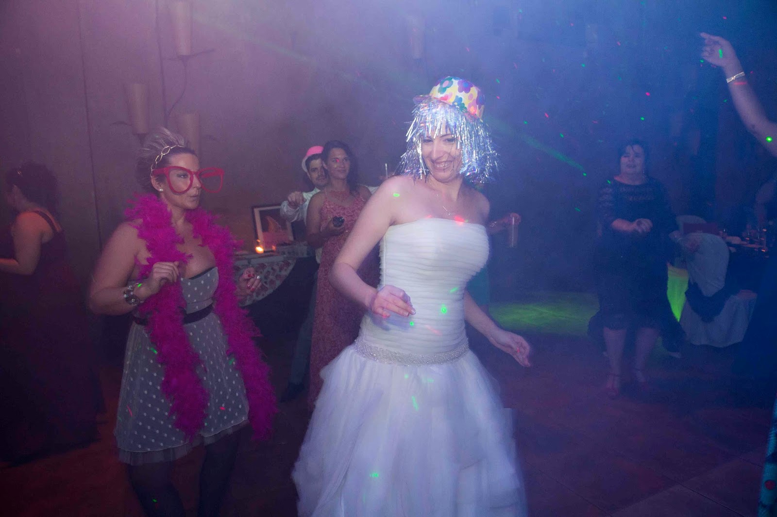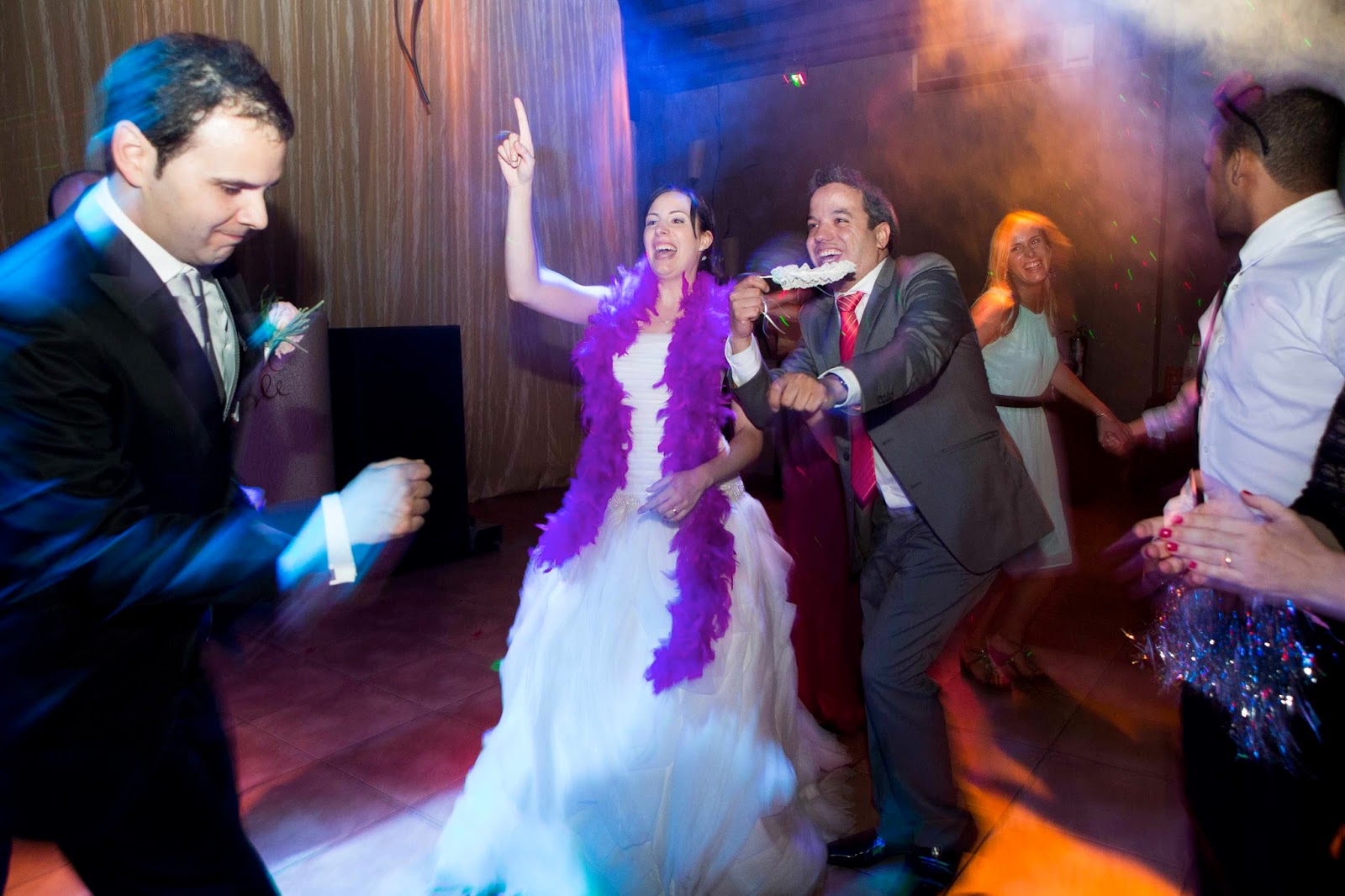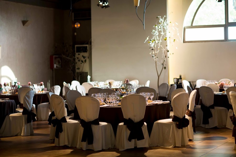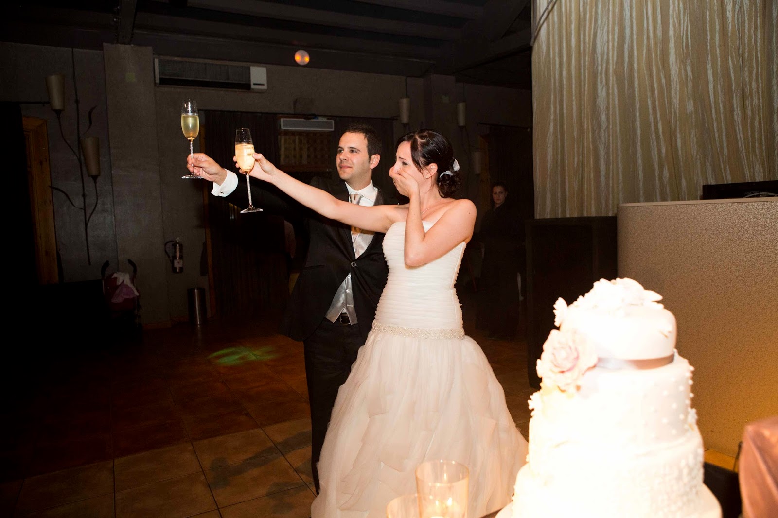 El banquete fue interior, en el salón. Los invitados estaban distribuidos en mesas redondas, el momento del corte de la tarta y el brindis fue muy emotivo para los novios.