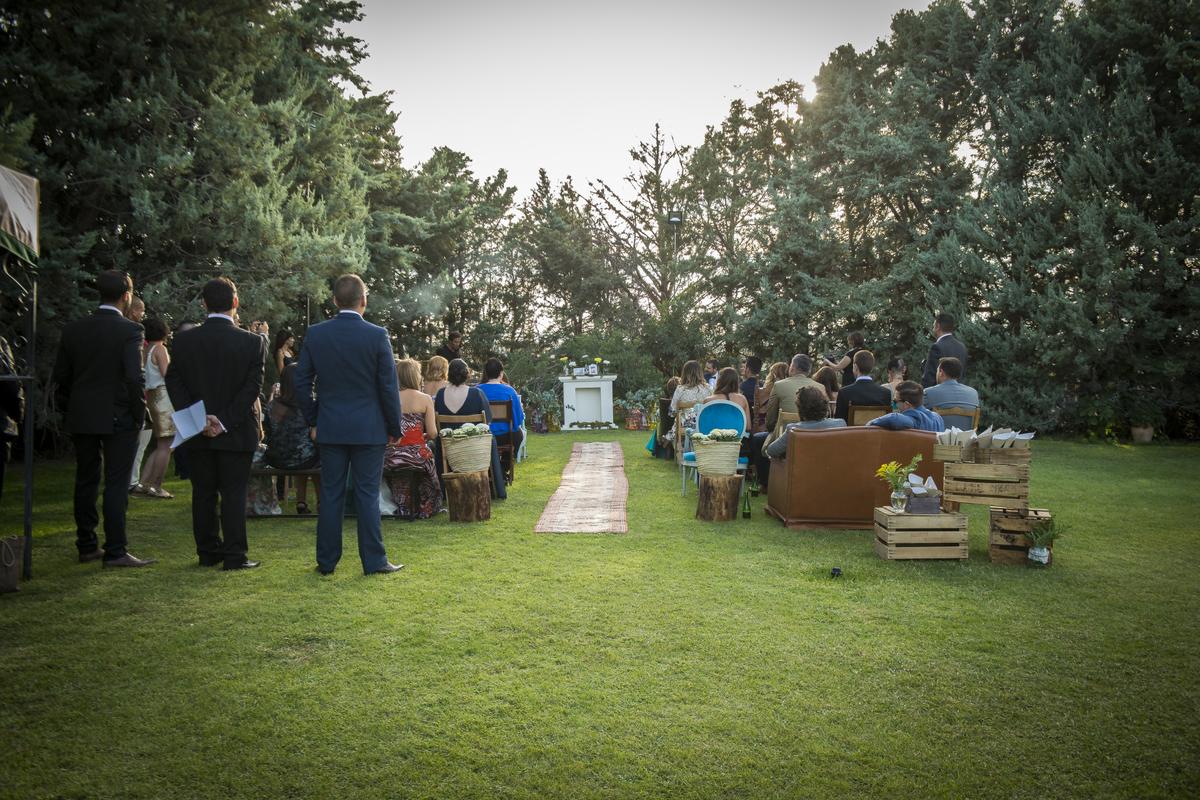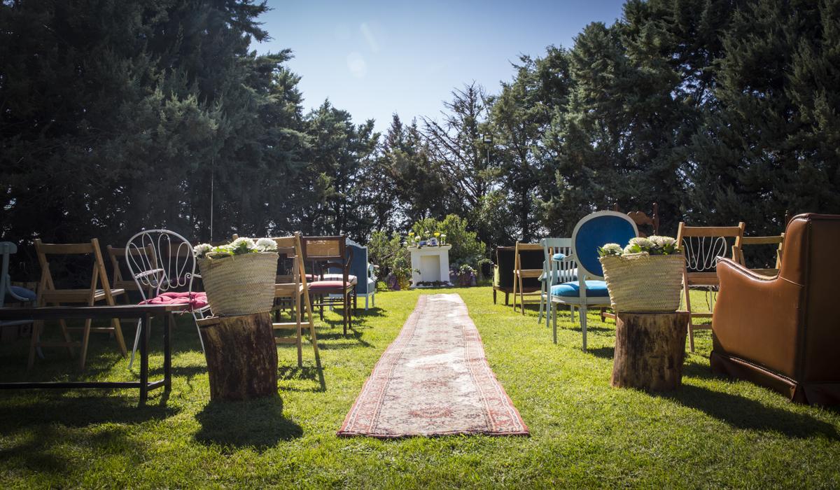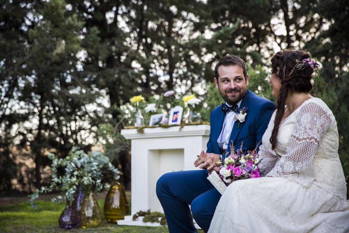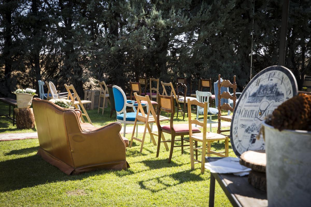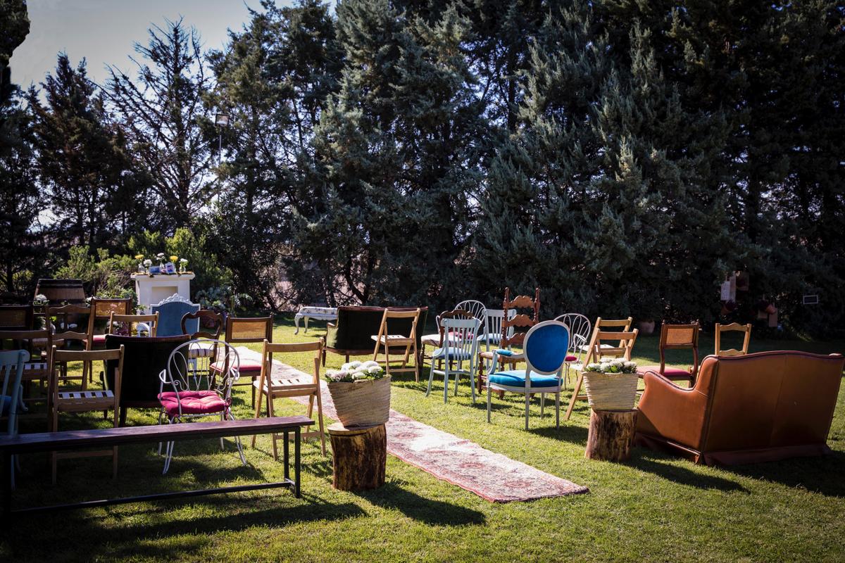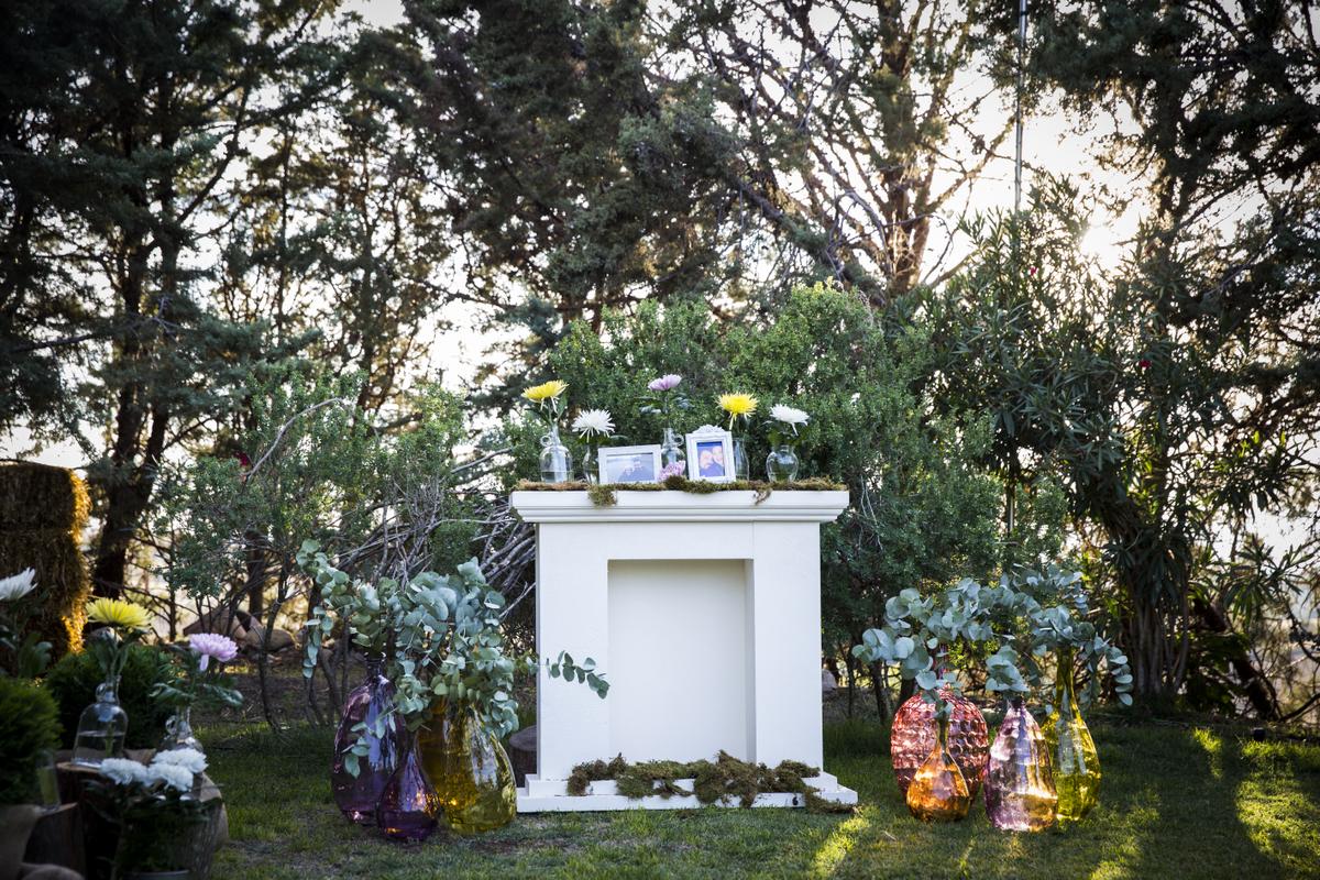 Llevábamos mucho tiempo con ganas de hacer una ceremonia civil como la que hicimos en la boda de Alexia y Rober, una ceremonia con un backdrop con una chimenea acompañada de damajuanas de distintos colores con helecho y un barril como mesa para el oficiante acompañado de troncos con botellas con flor que junto con sillas, sillones y bancos de diferente estilos y colores, dieron un toque precioso al conjunto.