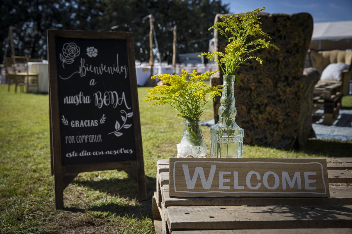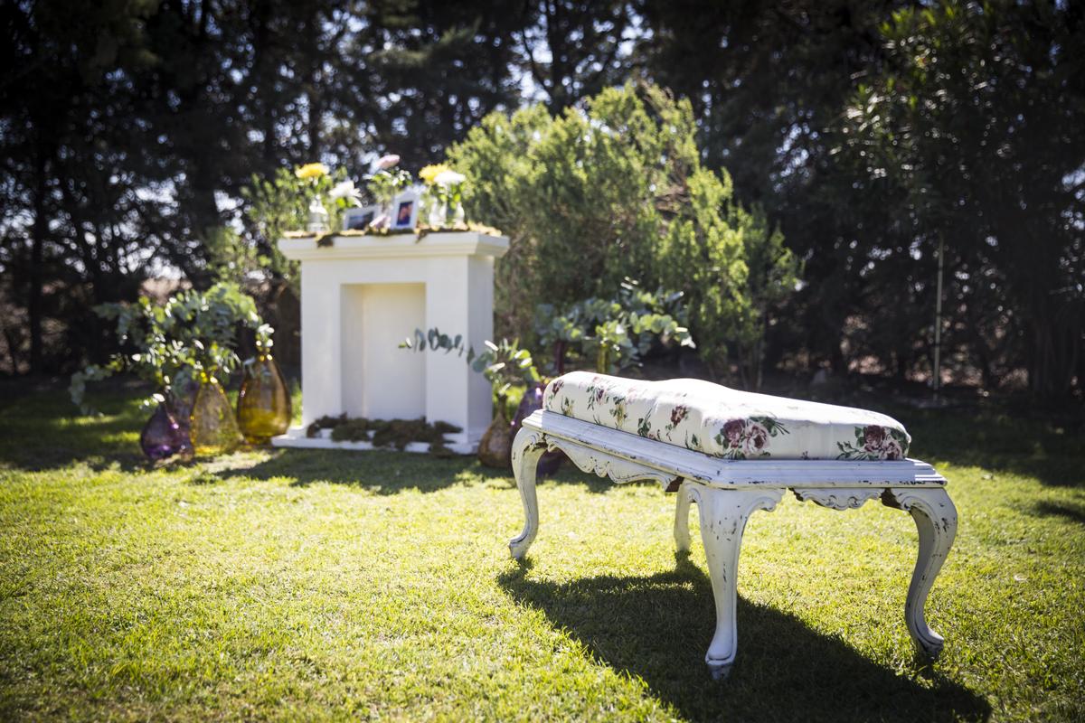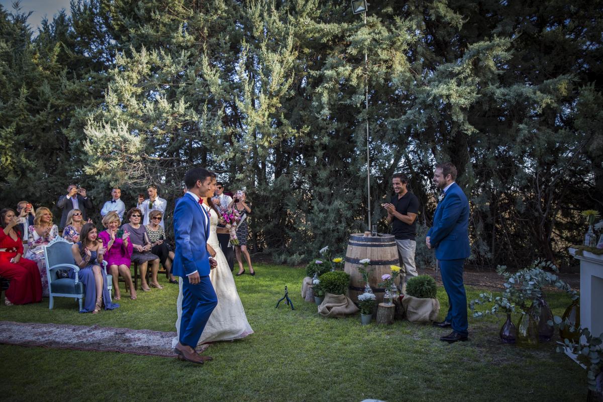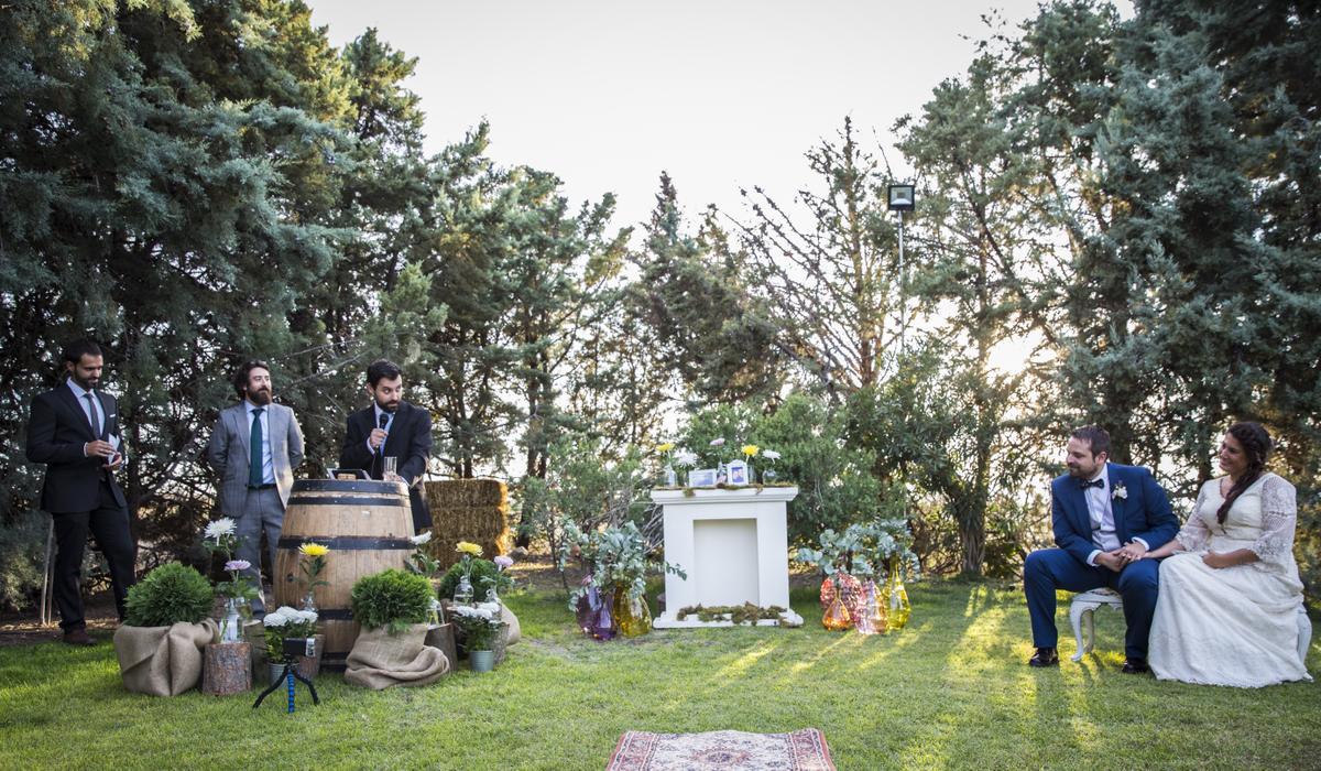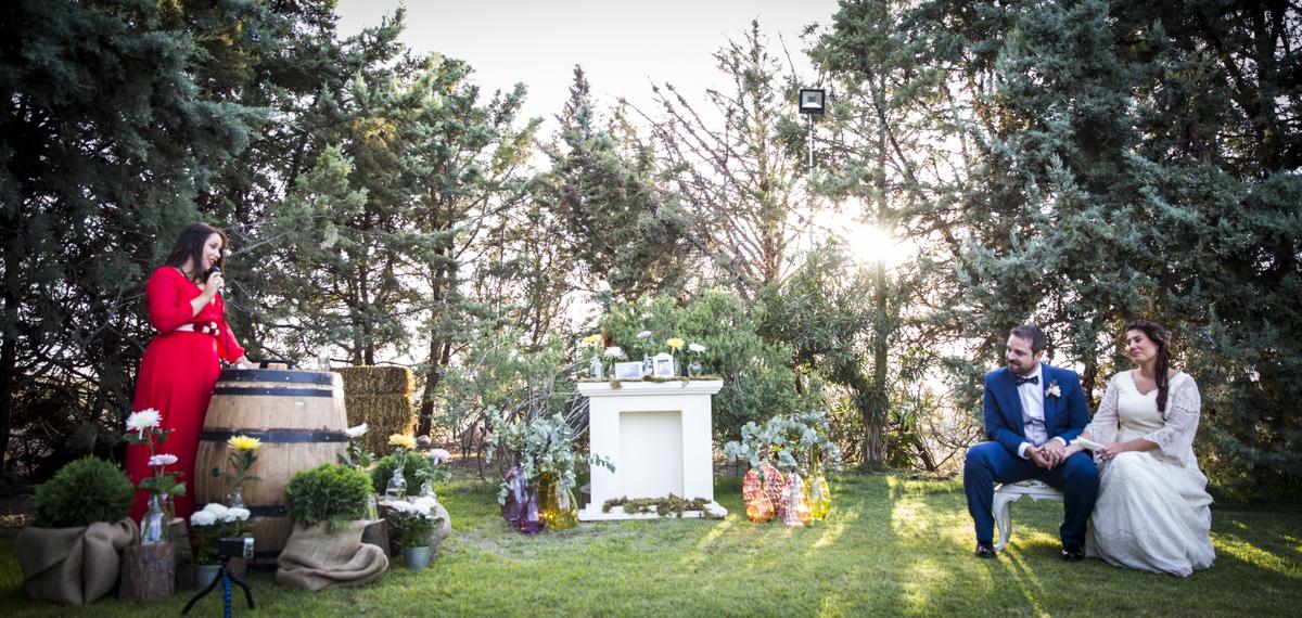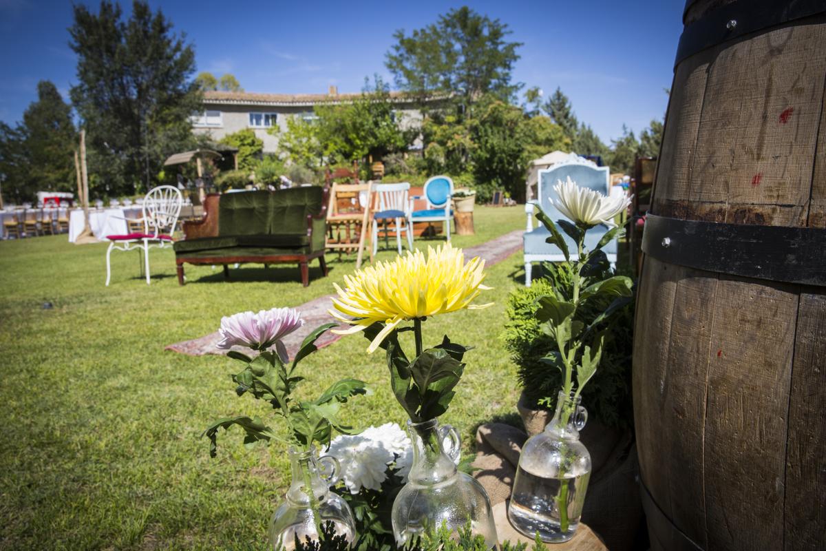 Llevábamos mucho tiempo con ganas de hacer una ceremonia civil como la que hicimos en la boda de Alexia y Rober, una ceremonia con un backdrop con una chimenea acompañada de damajuanas de distintos colores con helecho y un barril como mesa para el oficiante acompañado de troncos con botellas con flor que junto con sillas, sillones y bancos de diferente estilos y colores, dieron un toque precioso al conjunto.