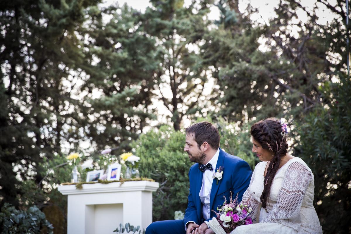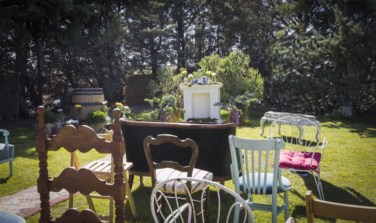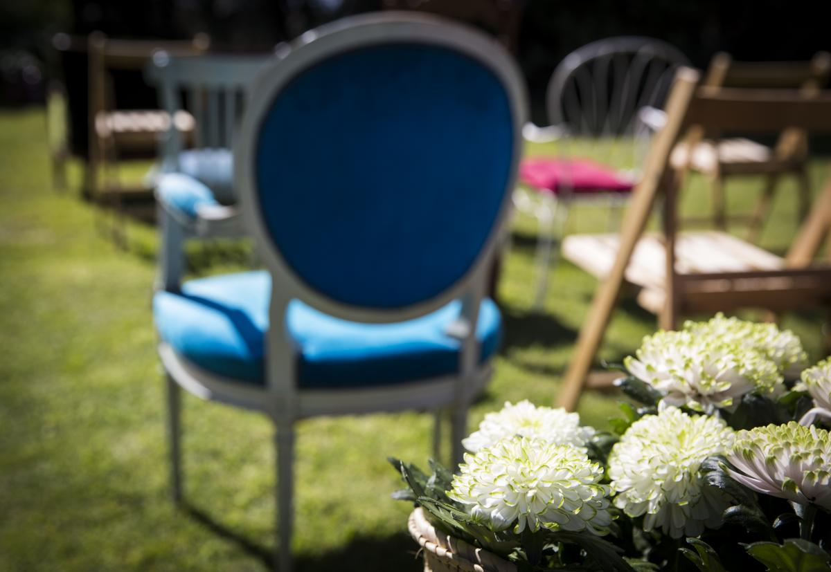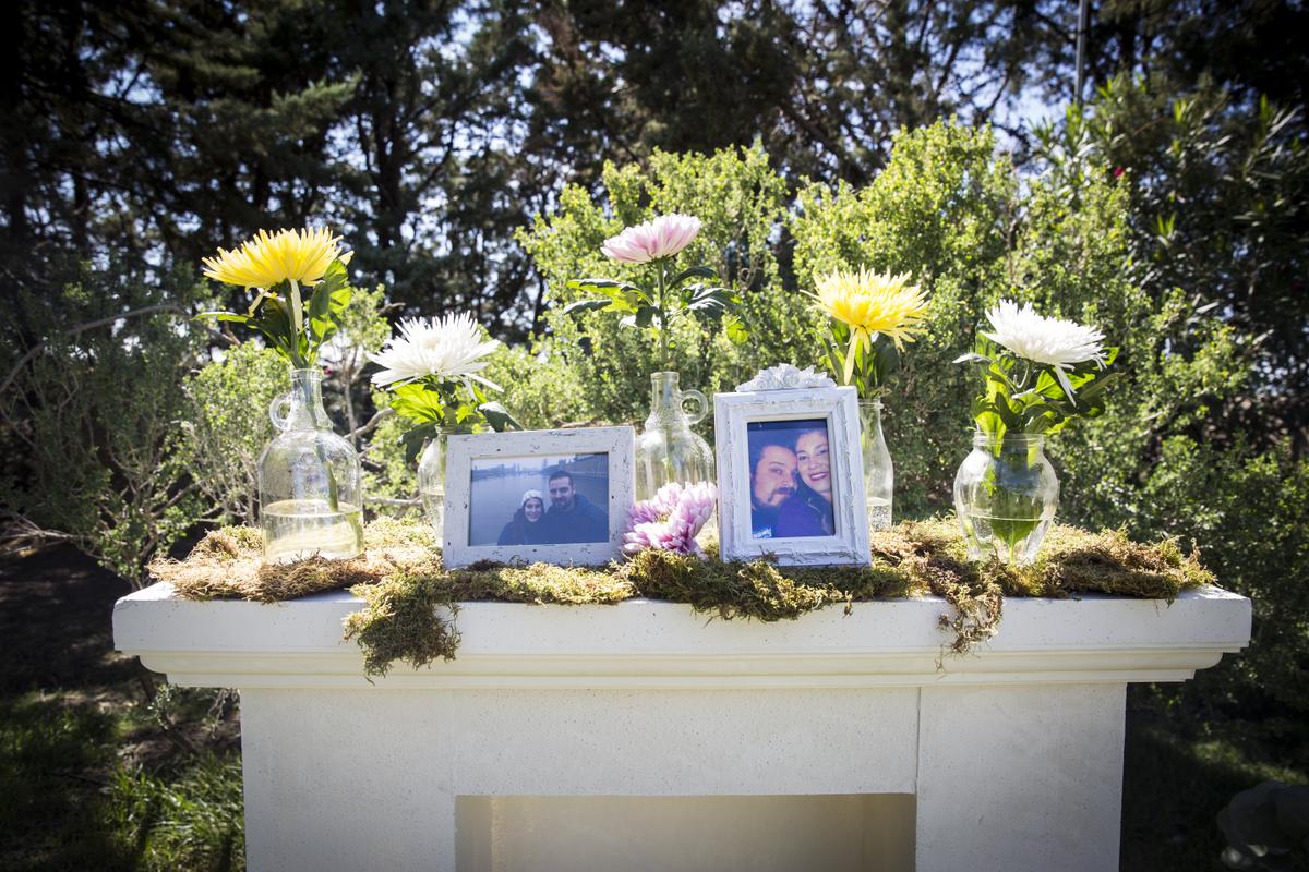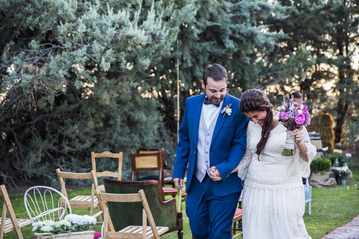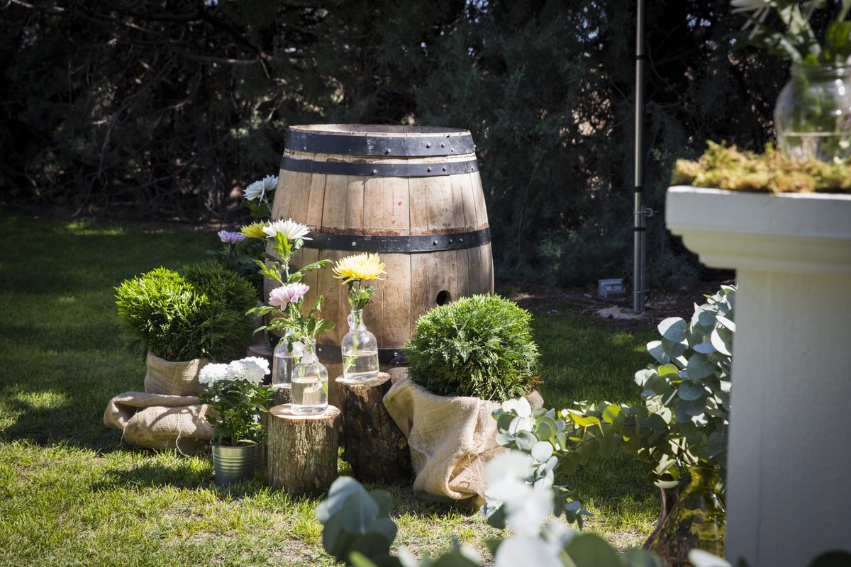 Llevábamos mucho tiempo con ganas de hacer una ceremonia civil como la que hicimos en la boda de Alexia y Rober, una ceremonia con un backdrop con una chimenea acompañada de damajuanas de distintos colores con helecho y un barril como mesa para el oficiante acompañado de troncos con botellas con flor que junto con sillas, sillones y bancos de diferente estilos y colores, dieron un toque precioso al conjunto.