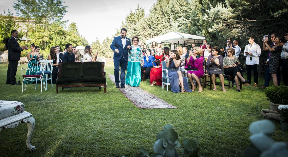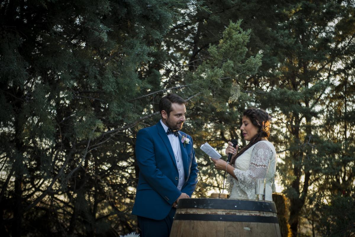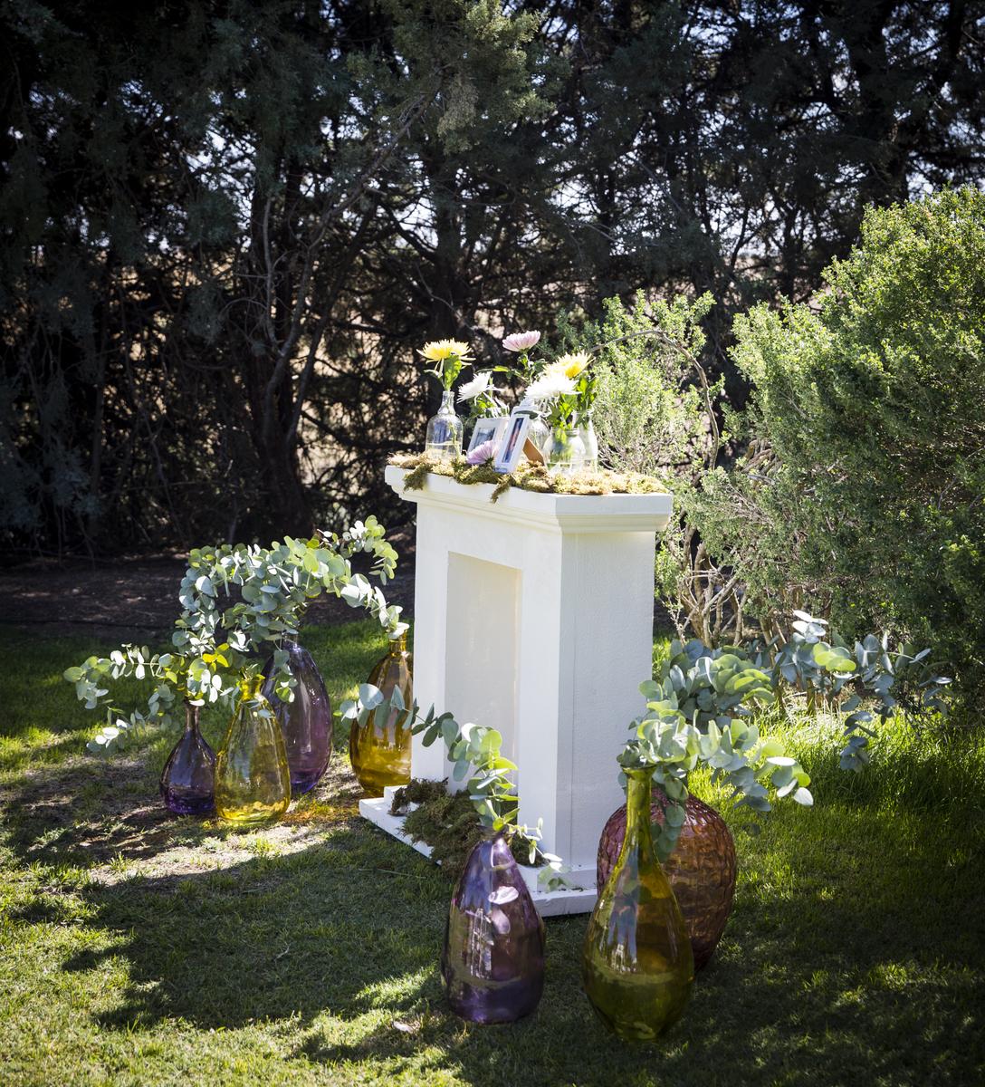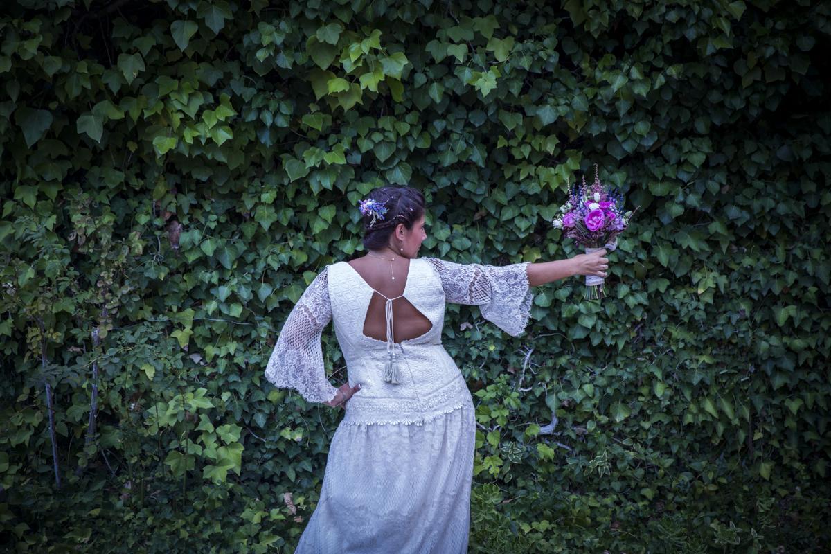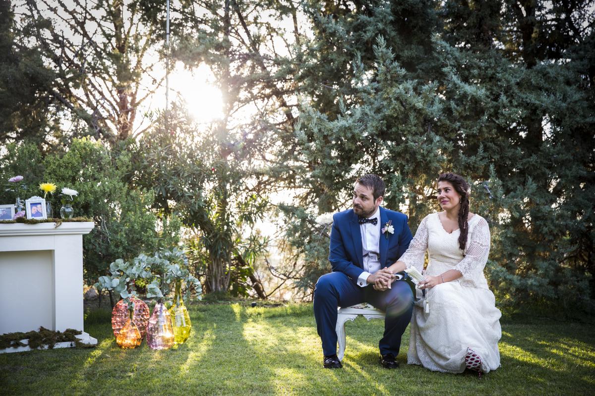 Llevábamos mucho tiempo con ganas de hacer una ceremonia civil como la que hicimos en la boda de Alexia y Rober, una ceremonia con un backdrop con una chimenea acompañada de damajuanas de distintos colores con helecho y un barril como mesa para el oficiante acompañado de troncos con botellas con flor que junto con sillas, sillones y bancos de diferente estilos y colores, dieron un toque precioso al conjunto.