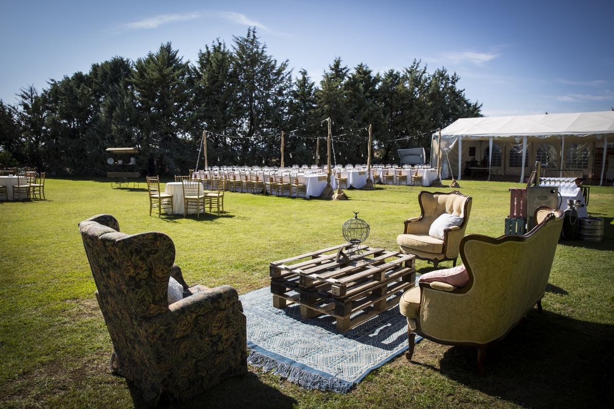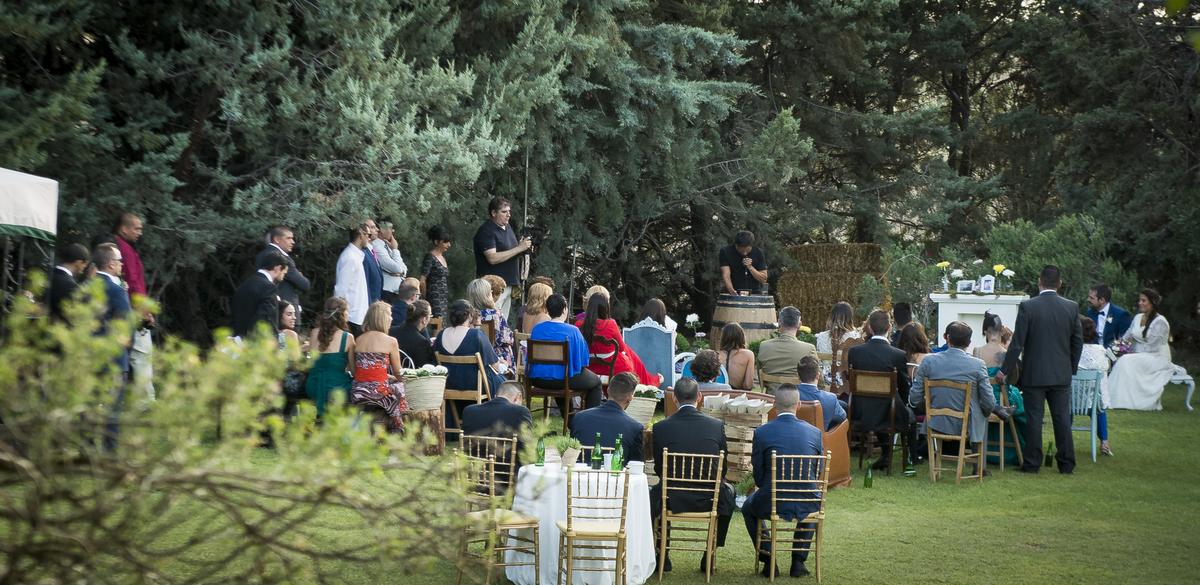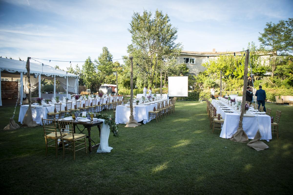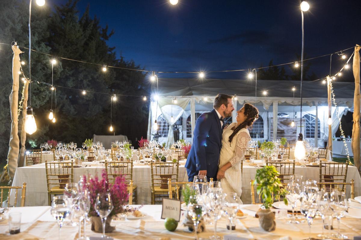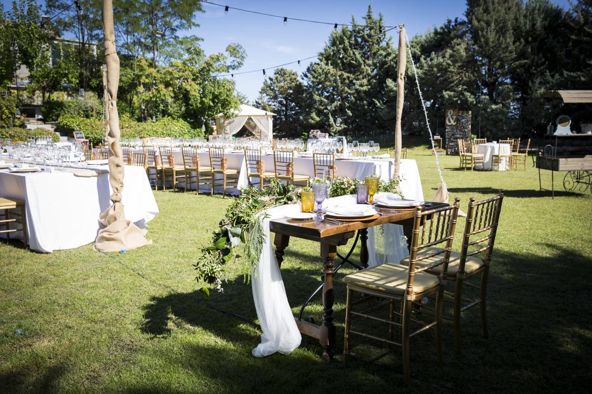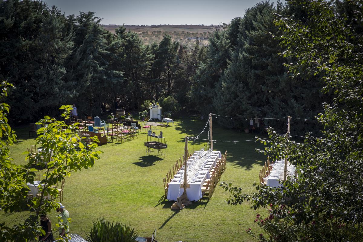 La boda de Alexia la realizamos en una finca en Navalcanero (Madrid). En la pradera de la finca distribuimos los distintos espacios de la boda. Una zona para la ceremonia civil, una para el cóctel, otra zona para la cena y por último una pequeña carpa para la barra libre.