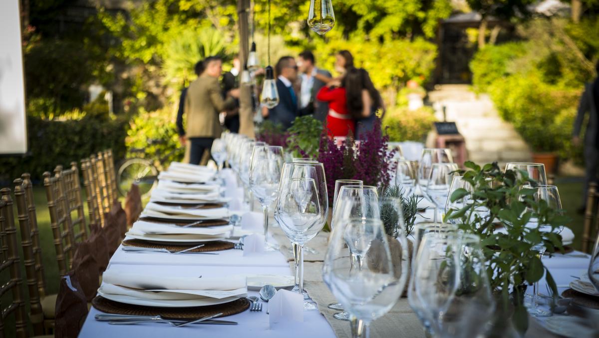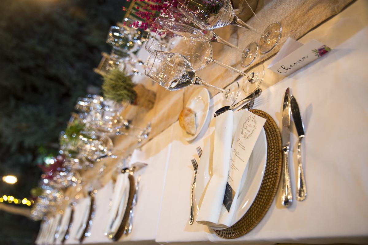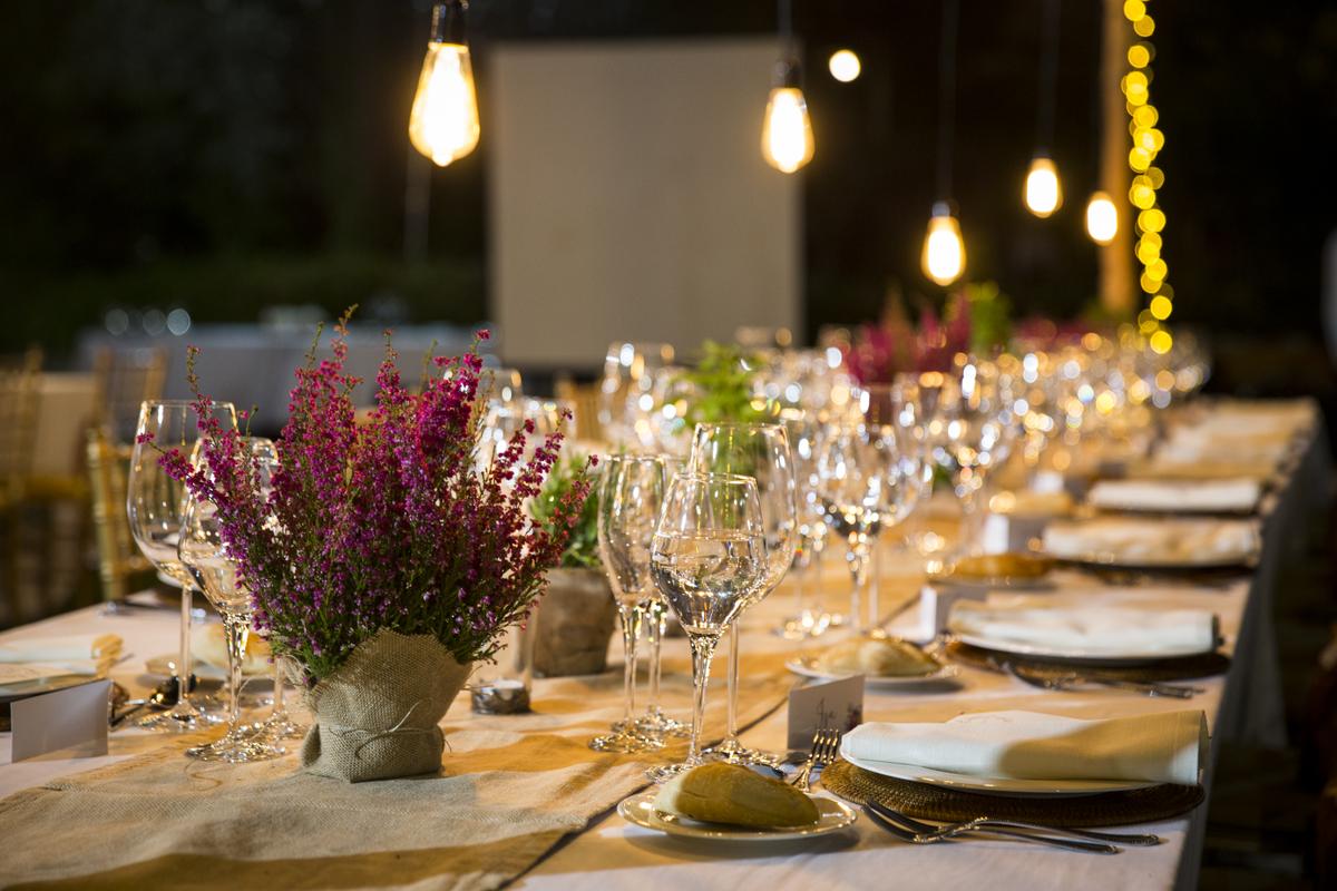Las mesas se componían de sillas Tiffany con manteles blancos, caminos de arpillera y centros de mesa con distintas combinaciones de plantas con unos bajoplatos de rafia. Unas mesas preciosas, sencillas y elegantes.