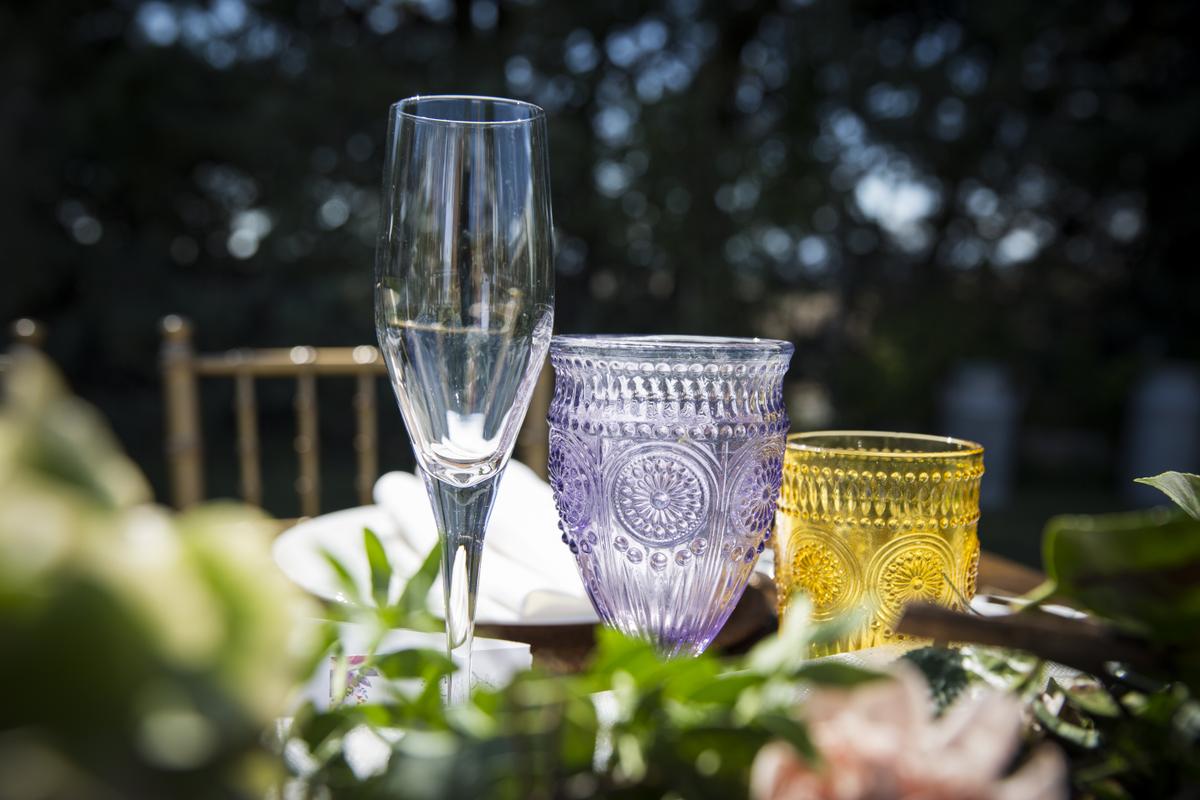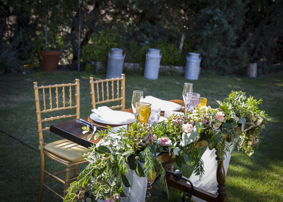 Los novios se sentaron solos. Su mesa llevaba una preciosa guirnalda llena de verde y de hortensias. Copas de color y una vajilla diferente. Y quedó espectacular. De boda de cuento.