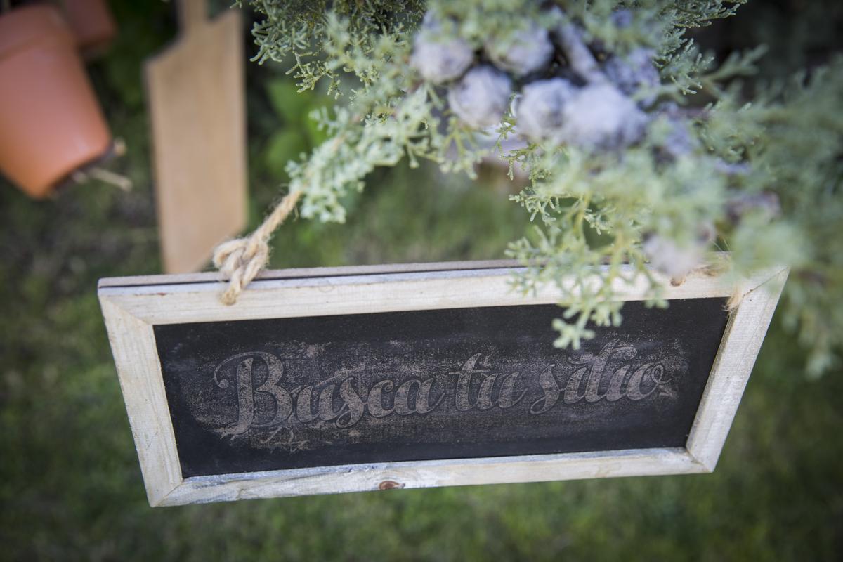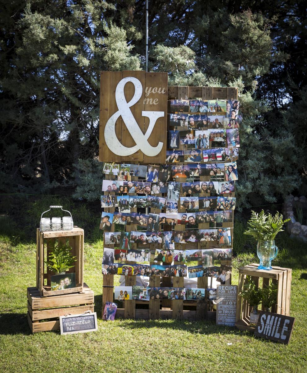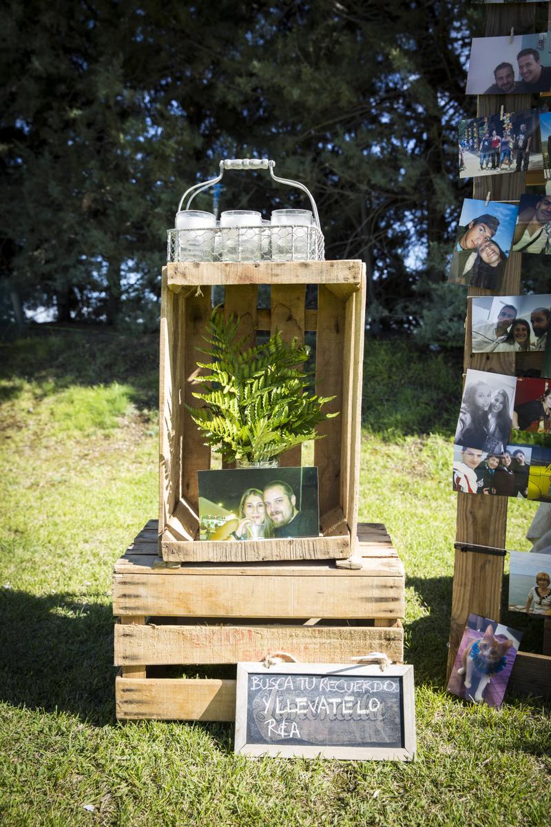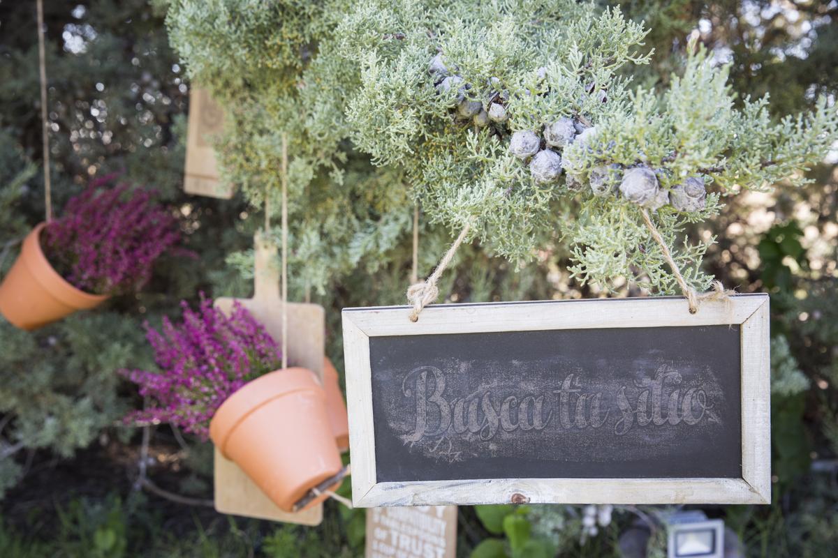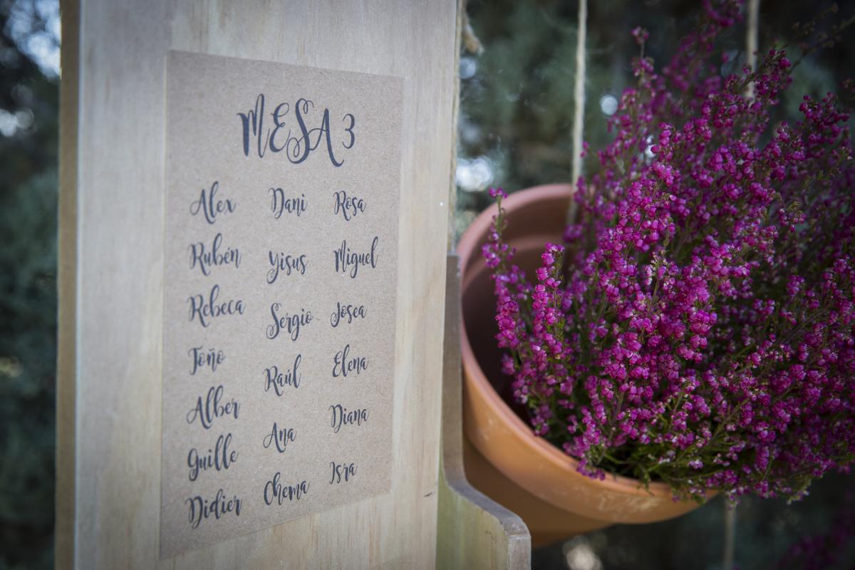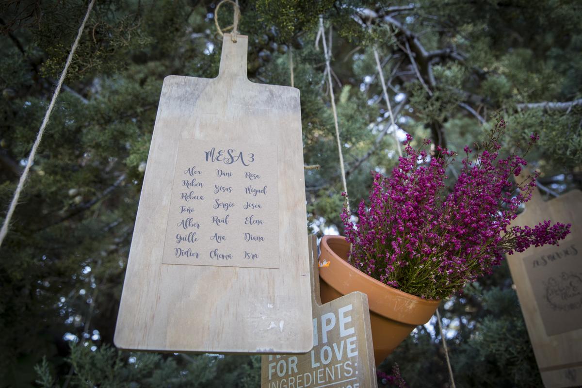 También hubo un rincón con fotografías de los novios con los invitados expresamente dedicadas. Cada uno se buscaba y se llevaba la foto de recuerdo. Y cómo no, un seating plan, esta vez con tablas de madera en las que aparecían las listas de las mesas combinadas con tiestos con flor.