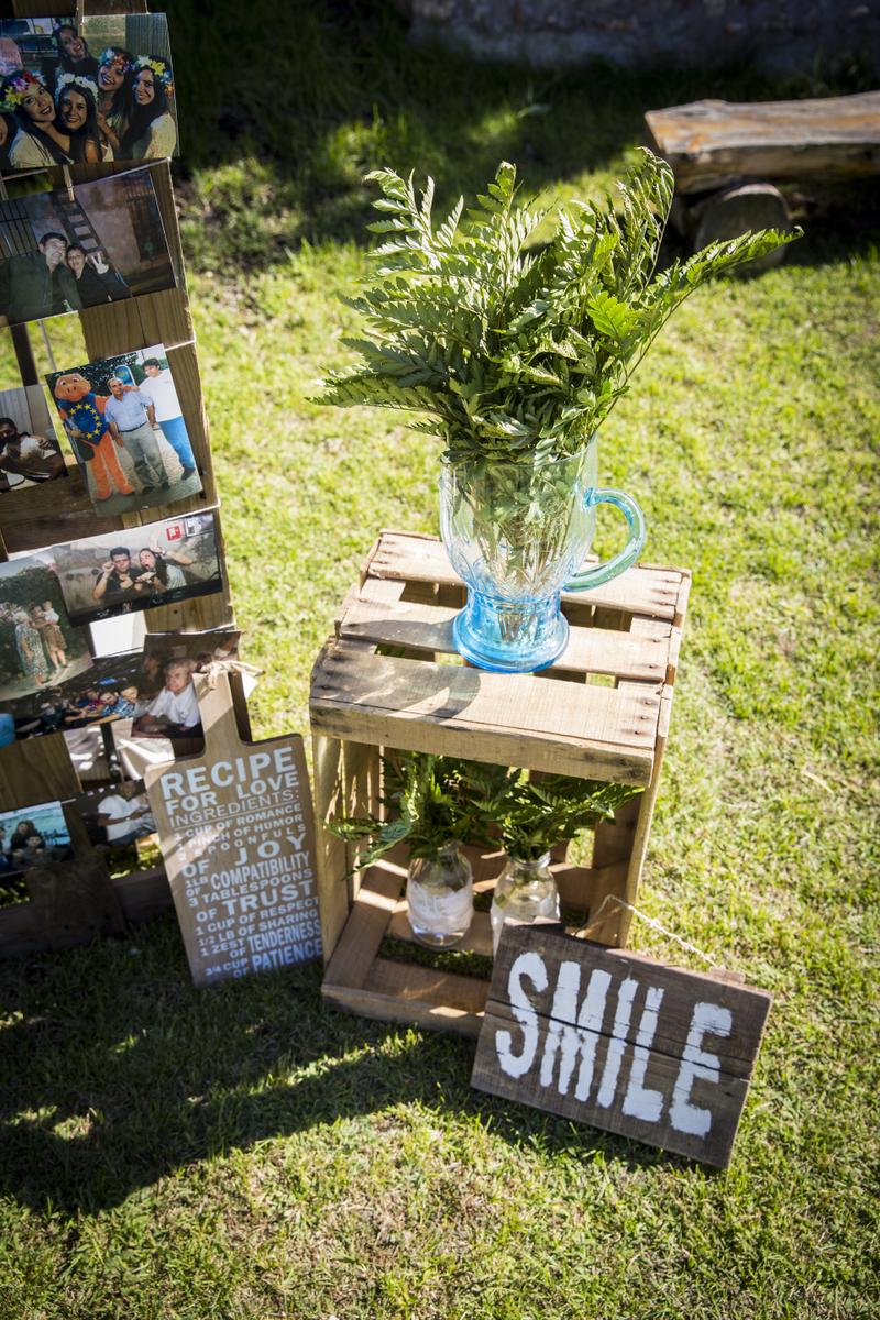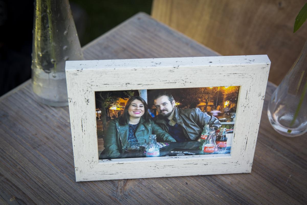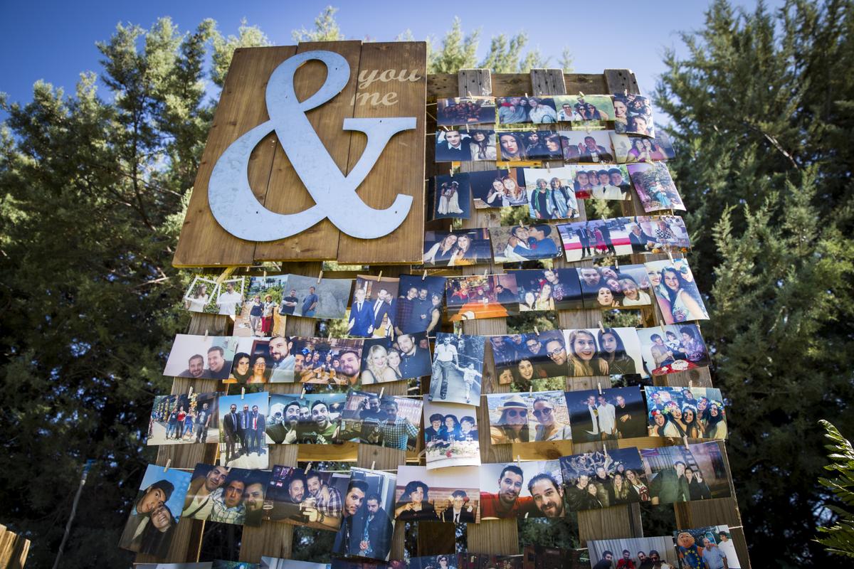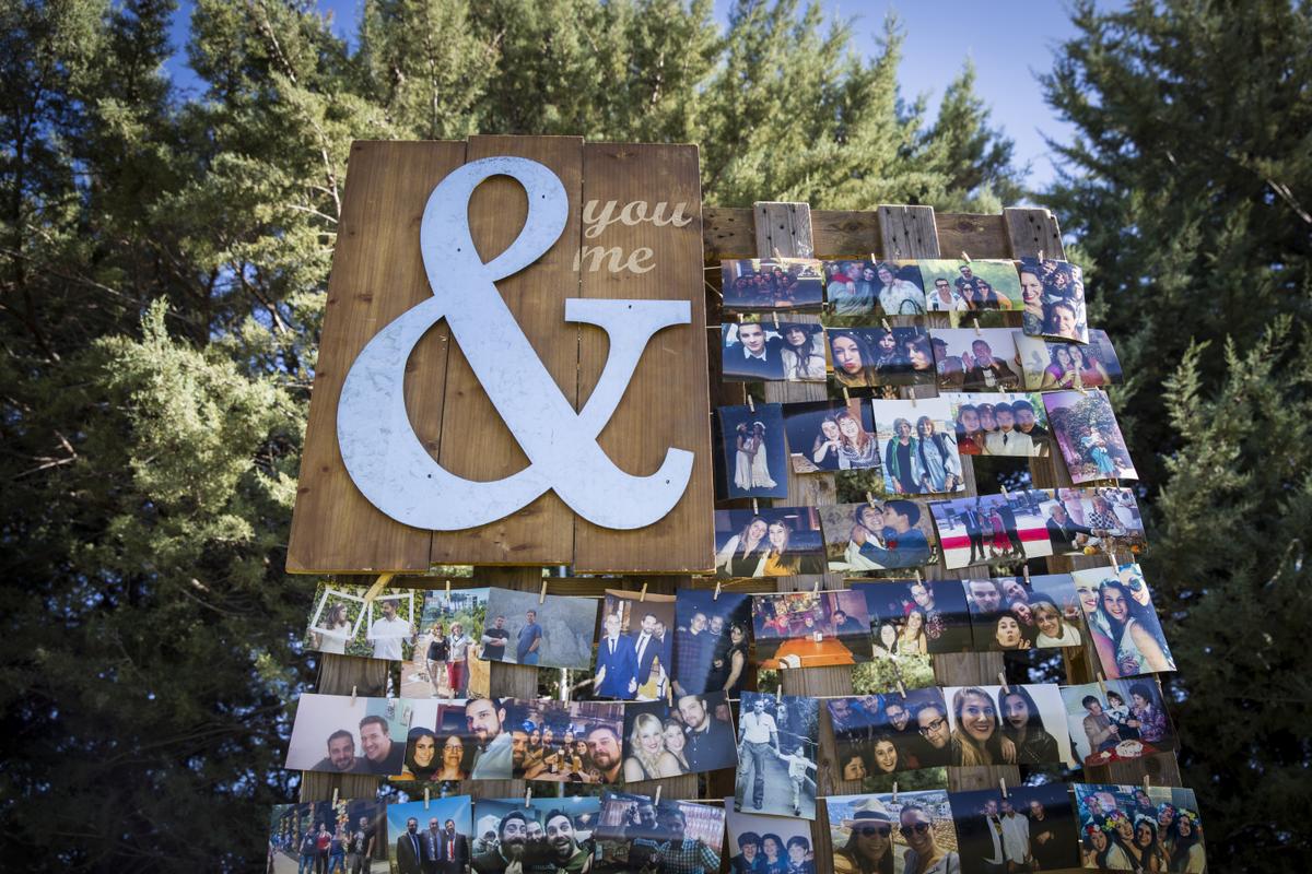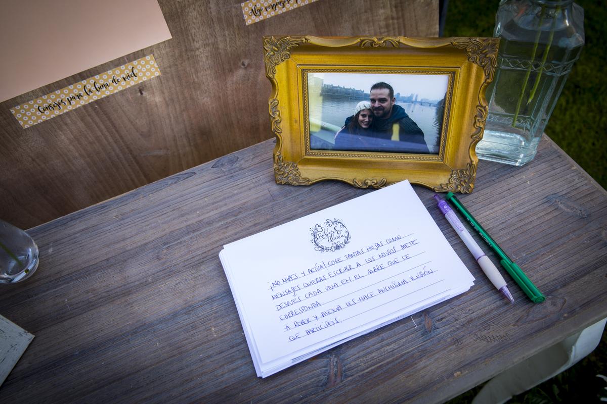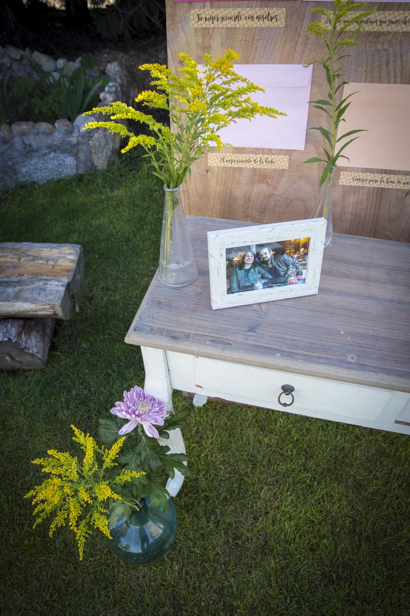 También hubo un rincón con fotografías de los novios con los invitados expresamente dedicadas. Cada uno se buscaba y se llevaba la foto de recuerdo. Y cómo no, un seating plan, esta vez con tablas de madera en las que aparecían las listas de las mesas combinadas con tiestos con flor.