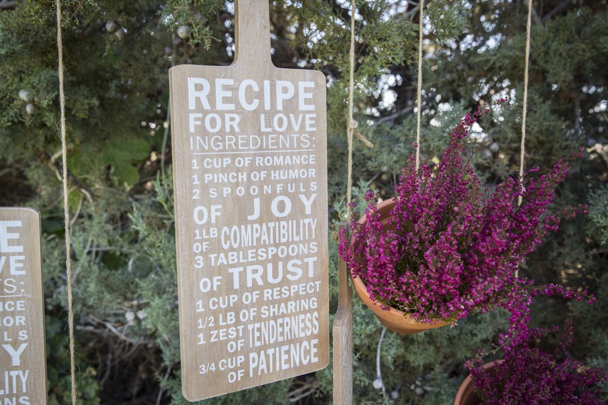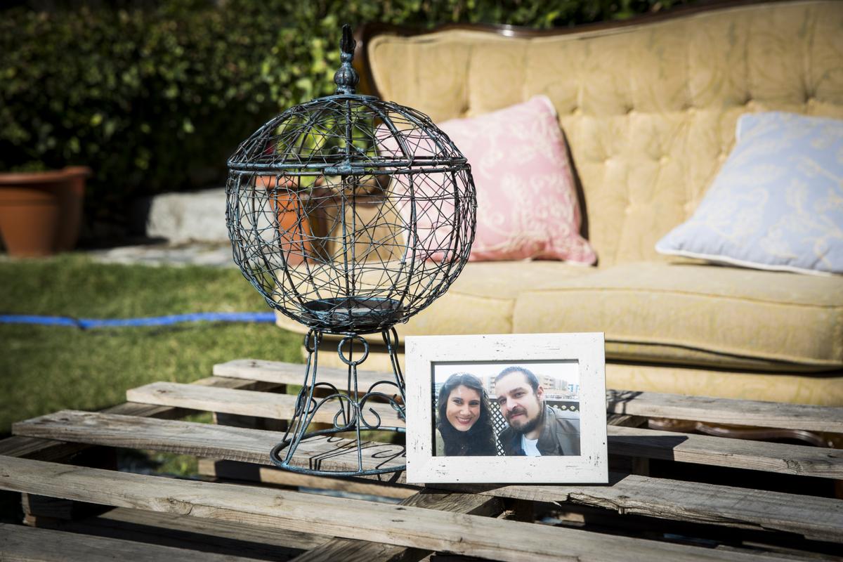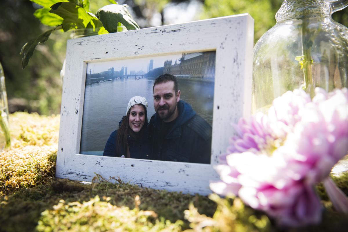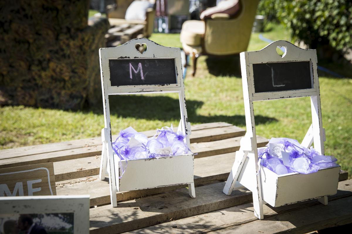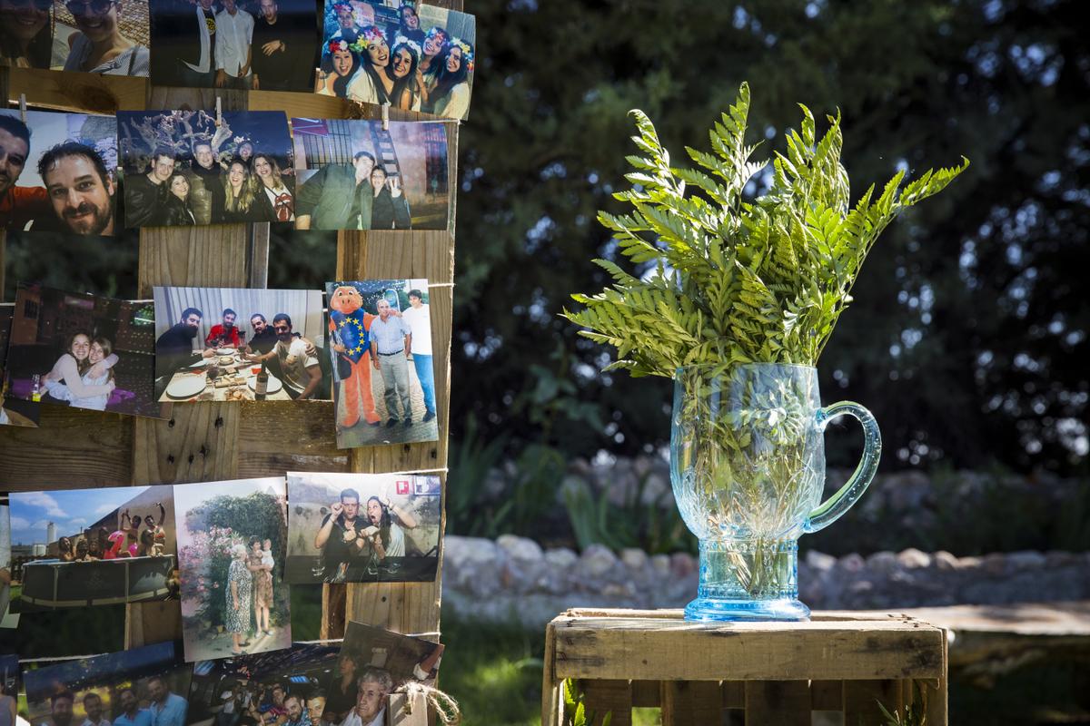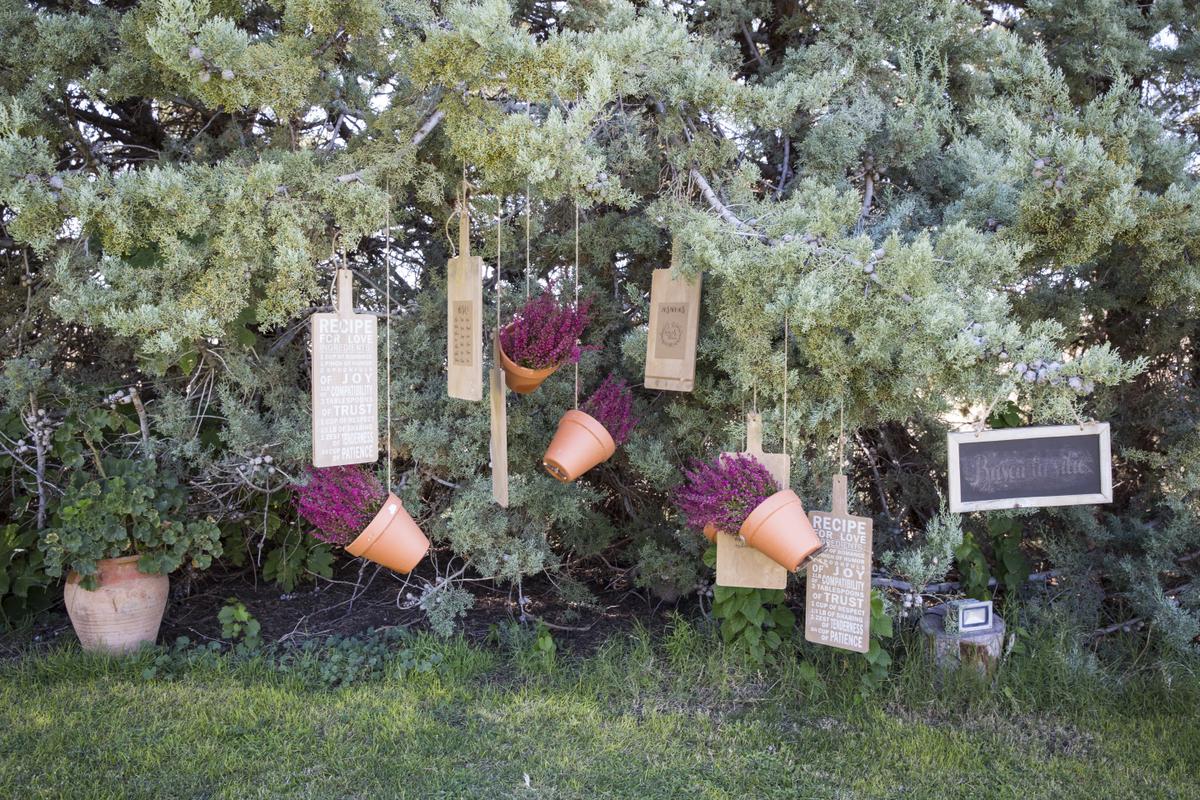 También hubo un rincón con fotografías de los novios con los invitados expresamente dedicadas. Cada uno se buscaba y se llevaba la foto de recuerdo. Y cómo no, un seating plan, esta vez con tablas de madera en las que aparecían las listas de las mesas combinadas con tiestos con flor.