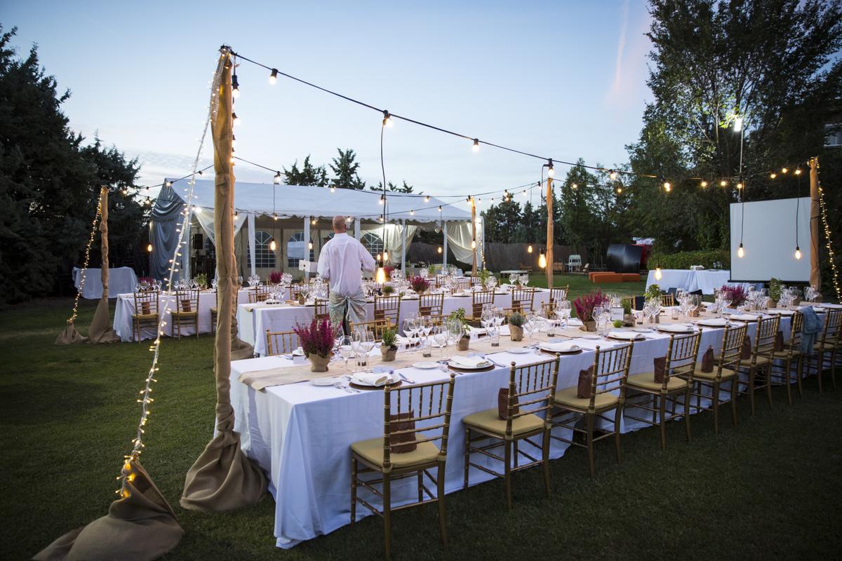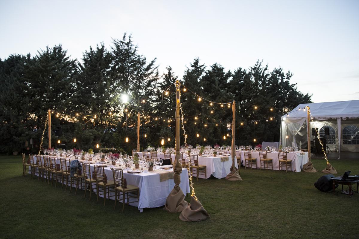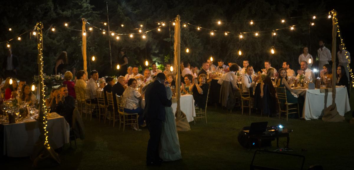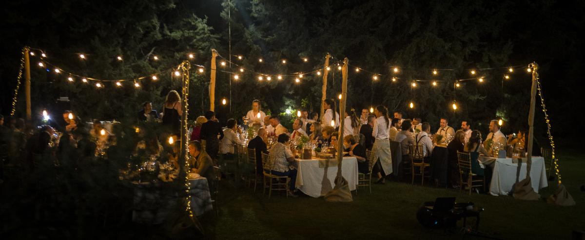Ya una vez en la zona de la cena, una maravillosa combinación de luces de verbena con bombillas de resistencia suspendidas sobre las mesas imperiales, hizo un precioso y maravilloso conjunto.