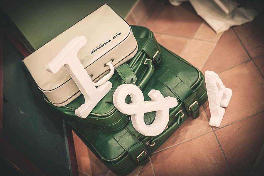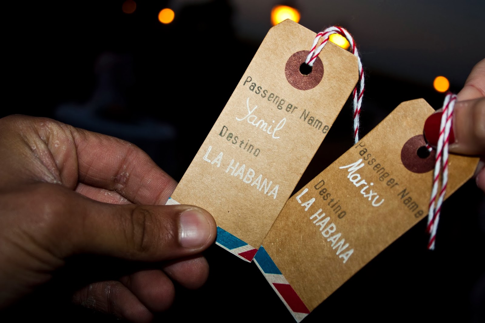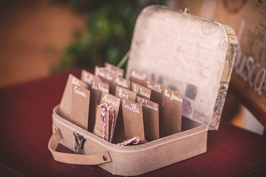 Me hacia muchísima ilusión que los invitados tuvieran algún recuerdo que llevarse de la mesa donde se iban a sentar, así que hice unas tarjetitas, imitando una antigua tarjeta de embarque, con su nombre y su mesa, y las colocamos todas, en una pequeña maletita vintage de cartón.