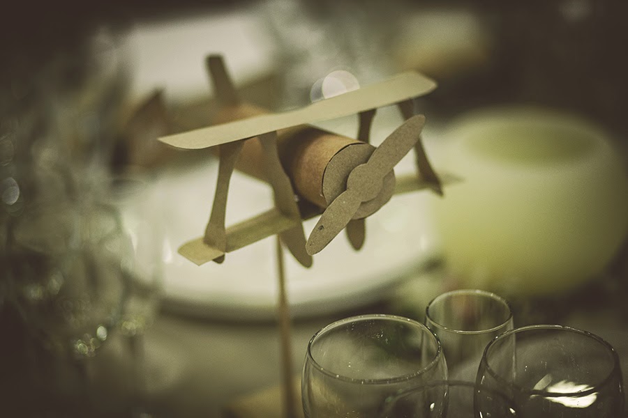 Para señalar cada mesa, en lugar del típico cartelito con el numero, hicimos aviones de cartón y les pusimos una especie de pancarta con el nombre de cada mesa.