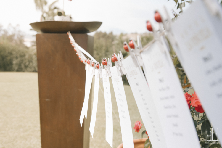 Entre los detalles del banquete destaca el seating, colgado con pinzas de mariquitas y el escritorio antiguo sobre el que pusieron el libro de firmas para que todos los invitados les dejaran un mensaje.