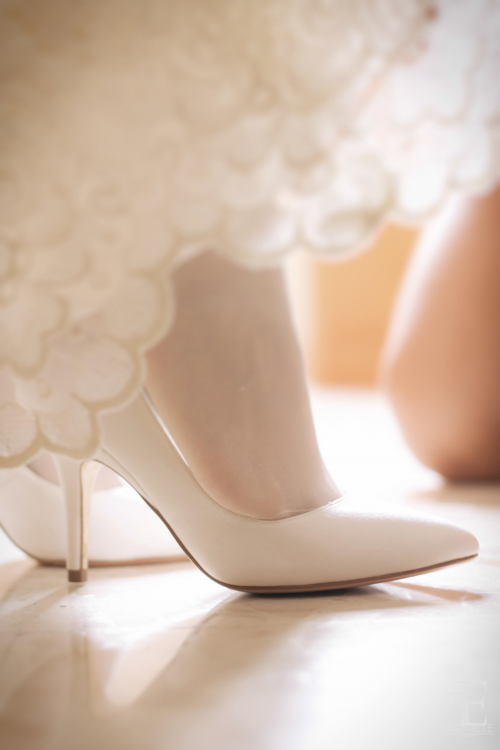 Los zapatos eran de Pura López, en concreto, el modelo Colette. Unos zapatos de salón de raso en color blanco roto, de punta fina y tacón alto, una perfecta combinación de elegancia y sencillez que casaba perfectamente con el vestido escogido. Los pendientes eran de oro blanco con incrustaciones brillantes y terminaban con una perla en forma de lágrima.