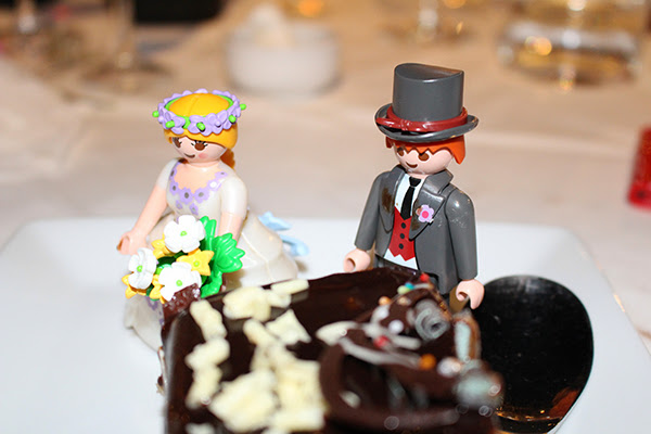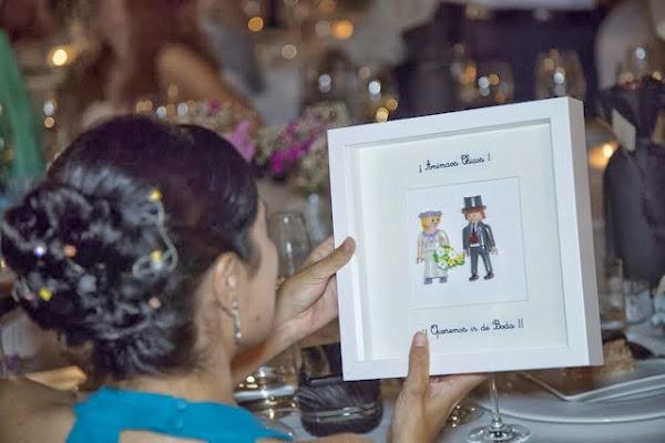 Más tarde le dimos un cuadro de novios de playmobils a las solteras, un ramo a la cuñada y a Inés y Raúl le preparamos una sorpresa por todo lo alto... Primero les hicimos bailar por todo el salón para darles un fin de semana de vacaciones (se lo habían ganado) y una lámina con una frase de Paulo Coelho.