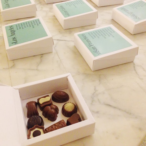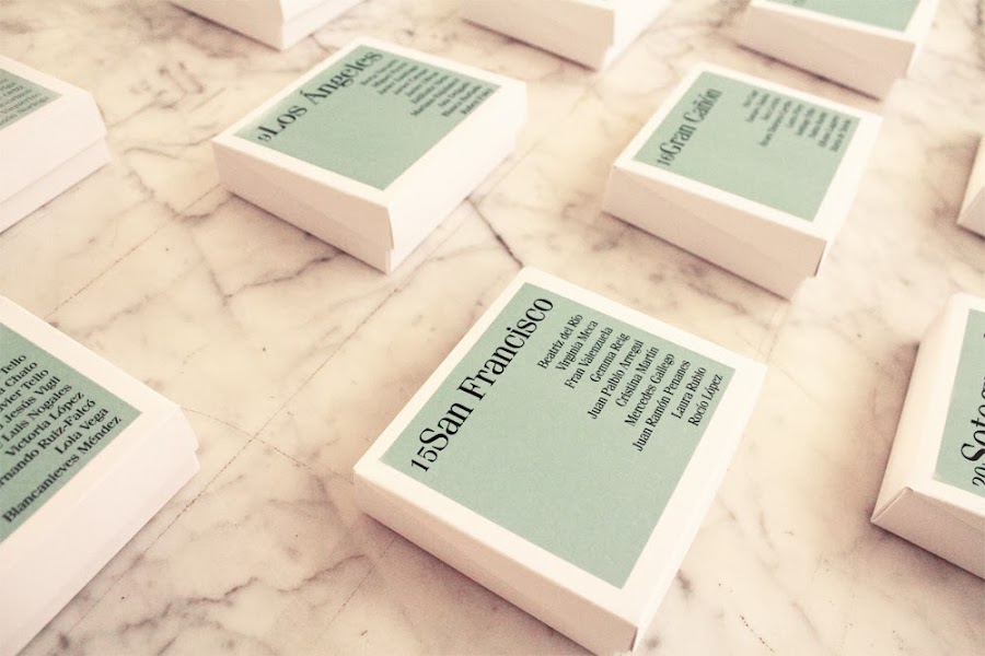 Porque no podía faltar un guiño a la caja de bombones que Forrest se va acabando durante toda la película mientras cuenta su historia. Como él, quisimos contar la historia de Itziar y Nacho con los lugares en los que habían viajado juntos, ofreciendo a cada invitado un bombón que les ubicase en la mesa en la que se tenían que sentar.