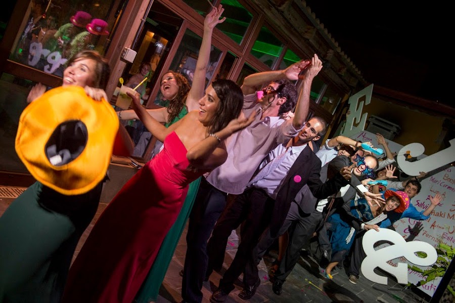 La fiesta continuó. En la zona de baile pusieron una mesa de dulces de la empresa La Dulce Lola y un photocall. Éste tenía un fondo blanco con el logo de la boda en negro en el medio y alrededor estaban escritos en tonos rosas y naranjas los nombres de los invitados, todo un detalle! Los complementos estuvieron formados por unos sombreros que compraron y los props que hizo Manualidades Creativas.