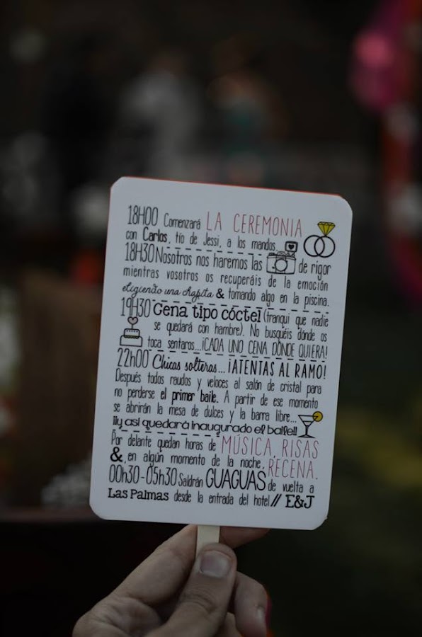 Durante la ceremonia, cada invitado tenía un paipai (perfecto para las bodas en verano) que los novios encargaron a Eventos Ilustrados, en él tenían detallados los momentos más importantes de la boda.