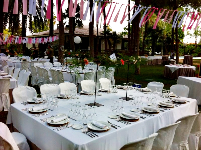La zona del banquete estaba decorada con una guirnalda de tela en tonos rosas y blancos de más de 50 metros que iba de árbol a árbol acotando la zona del almuerzo.