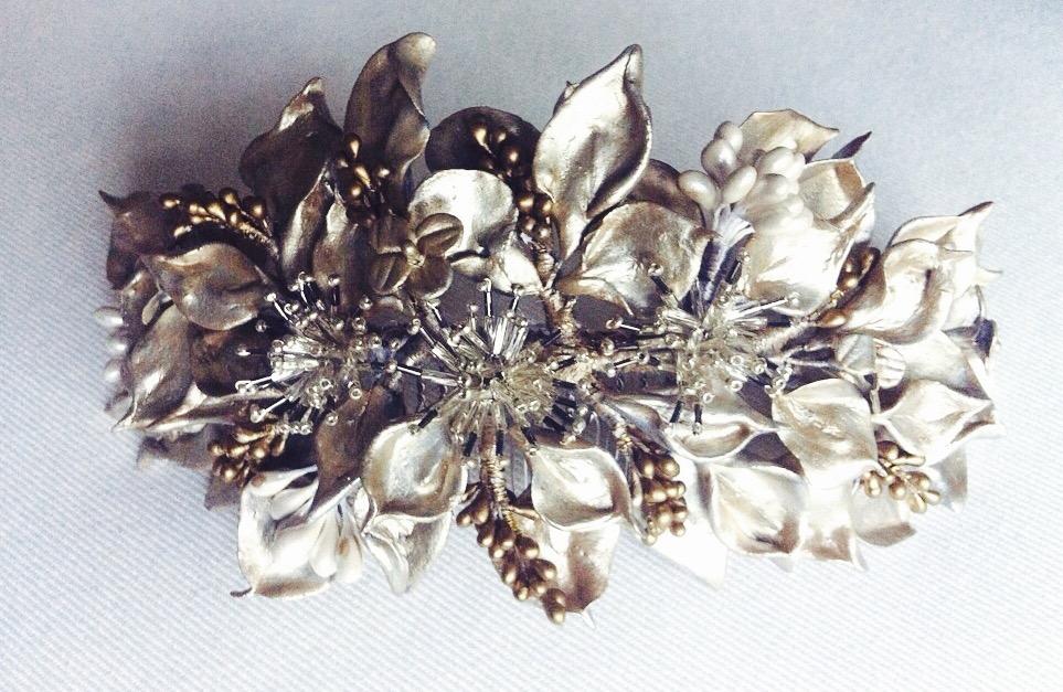 “En el pelo llevaba una trenza despeinada con un tocado de Cris Camón, una composición floral de porcelana fría moldeadas y pintadas a mano en color champagne con ramitas de pistilos dorados y 3 flores de pedrería en el centro, a juego con el detalle del cinturón que llevaba el vestido”