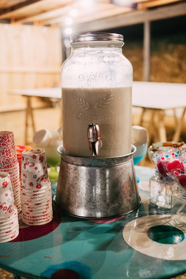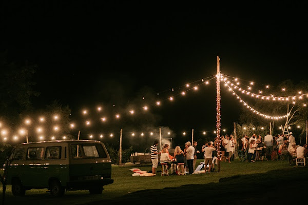 La cena corrió a mano manos de L’esclusivitá Catering, un cóctel y después sentando a los invitados en mesas imperiales , todo decorado como una noche de verbena, luces, caravana, cojines, etcc. , en plan informal que alargo, la fiesta hasta la madrugada.