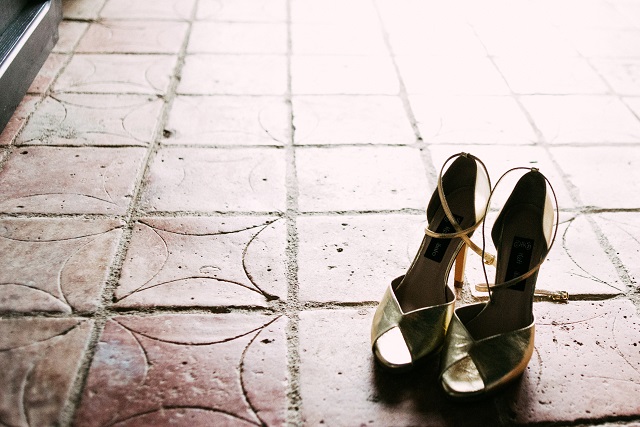 Zapatos dorado hechos medida de Keli& Salo,y ramo de novia , 2 cardos azules de Oh Fleurs!