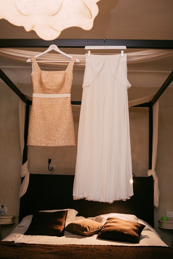 Dani, el novio, vistió un traje de Scalpers Navy y Erika, lució espectacular con un minivestido de RaquelFerreiroen pedrería con muñequeras en color champán, y un vestido superpuesto. Como complemento una tiara de Le Touquet , con un maquillaje y peluquería muy natural de mano de Diana Gali