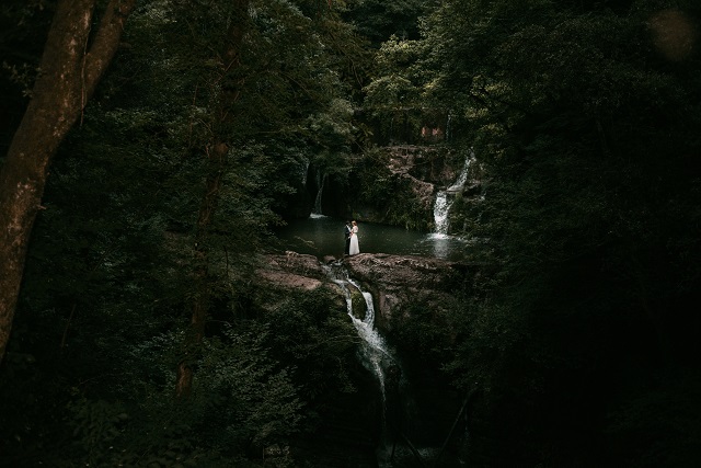 Mientras los invitados disfrutaban de la tarde, los novios, se fueron a realizar su sesión preboda , el Salt de Can Batlle, una entorno natural, donde una cascada de agua, inundaba todo el paisaje.